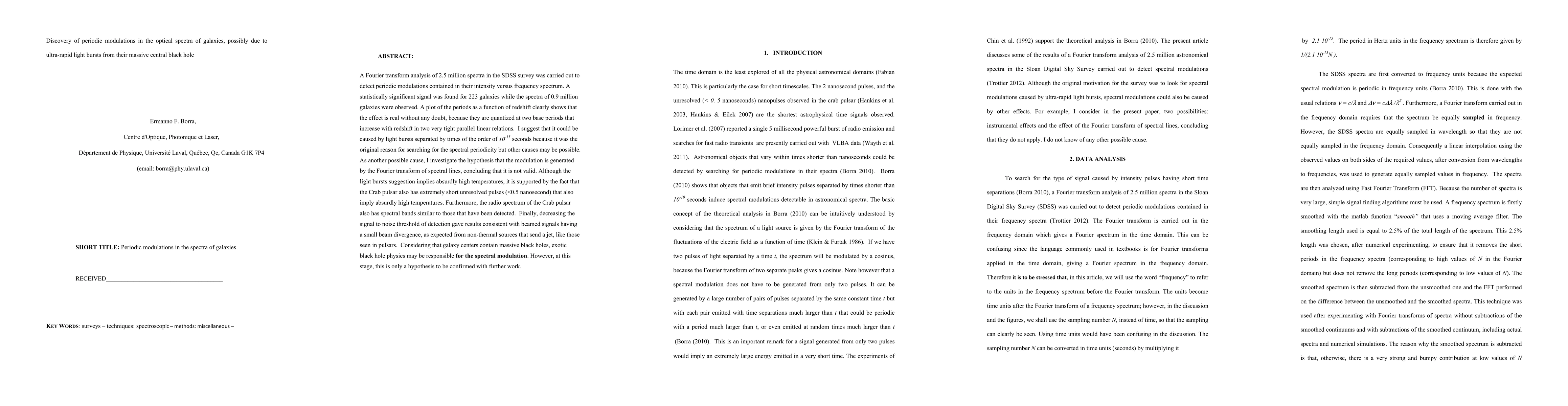 A Fourier transform analysis of 2.5 million spectra in the SDSS survey was carried out to detect periodic modulations contained in their intensity versus frequency spectrum. A statistically significant signal was found for 223 galaxies while the spectra of 0.9 million galaxies were observed. A plot of the periods as a function of redshift clearly shows that the effect is real without any doubt, because they are quantized at two base periods that increase with redshift in two very tight parallel linear relations. I suggest that it could be caused by light bursts separated by times of the order of 10-13 seconds because it was the original reason for searching for the spectral periodicity but other causes may be possible. As another possible cause, I investigate the hypothesis that the modulation is generated by the Fourier transform of spectral lines, concluding that it is not valid. Although the light bursts suggestion implies absurdly high temperatures, it is supported by the fact that the Crab pulsar also has extremely short unresolved pulses (<0.5 nanosecond) that also imply absurdly high temperatures. Furthermore, the radio spectrum of the Crab pulsar also has spectral bands similar to those that have been detected. Finally, decreasing the signal to noise threshold of detection gave results consistent with beamed signals having a small beam divergence, as expected from non-thermal sources that send a jet, like those seen in pulsars. Considering that galaxy centers contain massive black holes, exotic black hole physics may be responsible for the spectral modulation. However, at this stage, this is only a hypothesis to be confirmed with further work.