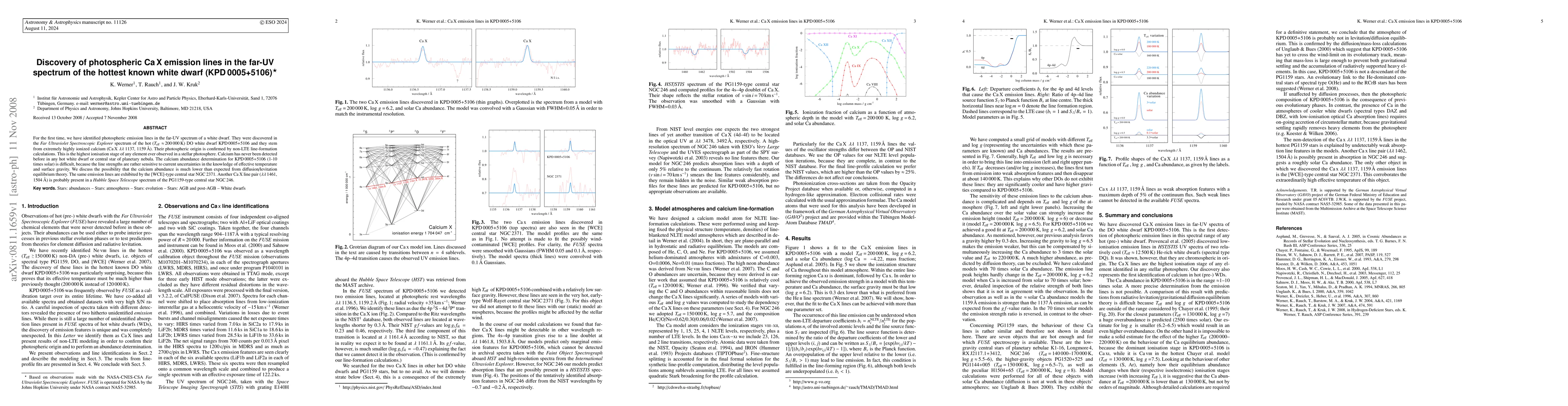 For the first time, we have identified photospheric emission lines in the far-UV spectrum of a white dwarf. They were discovered in the Far Ultraviolet Spectroscopic Explorer spectrum of the hot (Teff~200,000 K) DO white dwarf KPD0005+5106 and they stem from extremely highly ionized calcium (CaX 1137, 1159 Ang). Their photospheric origin is confirmed by non-LTE line-formation calculations. This is the highest ionisation stage of any element ever observed in a stellar photosphere. Calcium has never been detected before in any hot white dwarf or central star of planetary nebula. The calcium abundance determination for KPD0005+5106 (1-10 times solar) is difficult, because the line strengths are rather sensitive to current uncertainties in the knowledge of effective temperature and surface gravity. We discuss the possibility that the calcium abundance is much lower than expected from diffusion/levitation equilibrium theory. The same emission lines are exhibited by the [WCE]-type central star NGC2371. Another CaX line pair (1461, 1504 Ang) is probably present in a Hubble Space Telescope spectrum of the PG1159-type central star NGC246.