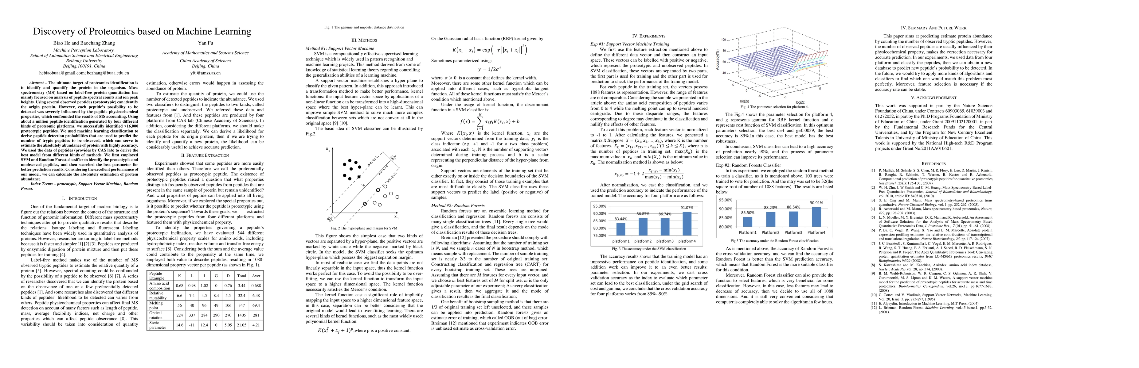 This research paper details the use of machine learning, specifically Support Vector Machines (SVM) and Random Forest classifiers, to predict peptide detection probabilities. This method improves the estimation of protein abundance by accounting for the varying detection probabilities influenced by peptide physicochemical properties. The study successfully identified over 16,000 proteotypic peptides, offering a more accurate method for proteomics analysis.