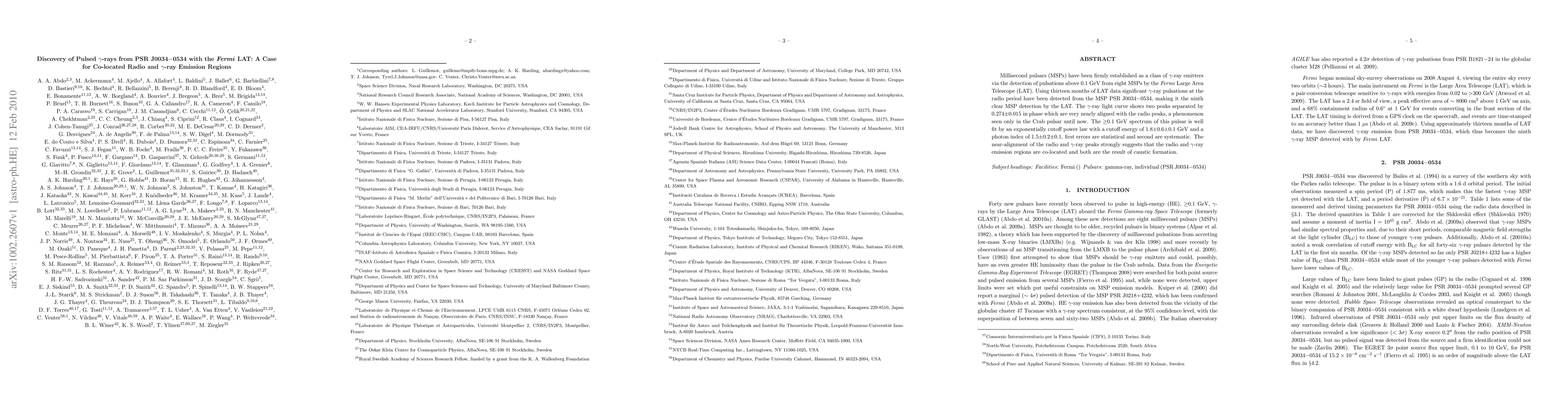 Millisecond pulsars (MSPs) have been firmly established as a class of gamma-ray emitters via the detection of pulsations above 0.1 GeV from eight MSPs by the Fermi Large Area Telescope (LAT). Using thirteen months of LAT data significant gamma-ray pulsations at the radio period have been detected from the MSP PSR J0034-0534, making it the ninth clear MSP detection by the LAT. The gamma-ray light curve shows two peaks separated by 0.274$\pm$0.015 in phase which are very nearly aligned with the radio peaks, a phenomenon seen only in the Crab pulsar until now. The $\geq$0.1 GeV spectrum of this pulsar is well fit by an exponentially cutoff power law with a cutoff energy of 1.8$\pm 0.6\pm$0.1 GeV and a photon index of 1.5$\pm 0.2\pm$0.1, first errors are statistical and second are systematic. The near-alignment of the radio and gamma-ray peaks strongly suggests that the radio and gamma-ray emission regions are co-located and both are the result of caustic formation.