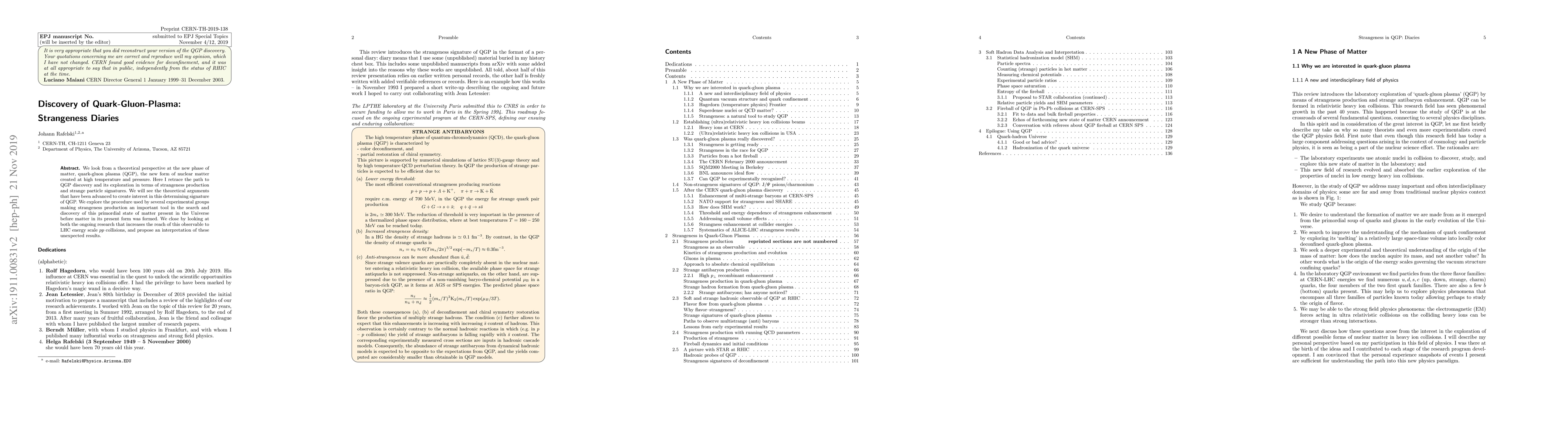 We look from a theoretical perspective at the new phase of matter, quark-gluon plasma (QGP), the new form of nuclear matter created at high temperature and pressure. Here I retrace the path to QGP discovery and its exploration in terms of strangeness production and strange particle signatures. We will see the theoretical arguments that have been advanced to create interest in this determining signature of QGP. We explore the procedure used by several experimental groups making strangeness production an important tool in the search and discovery of this primordial state of matter present in the Universe before matter in its present form was formed. We close by looking at both the ongoing research that increases the reach of this observable to LHC energy scale $pp$ collisions, and propose an interpretation of these unexpected results.