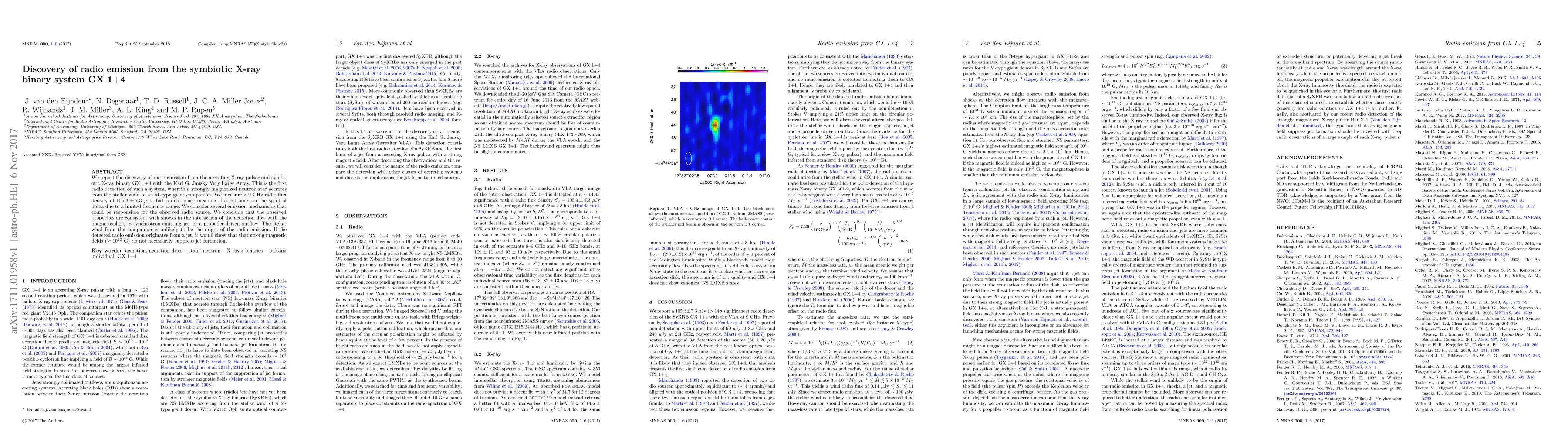 The first radio detection of the symbiotic X-ray binary system GX 1+4 has been reported, revealing a $9$ GHz radio flux density of $105.3 \pm 7.3$ $\mu$Jy, suggesting emission mechanisms like shocks, synchrotron-emitting jets, or propeller-driven outflows. This discovery indicates that strong magnetic fields do not inhibit jet formation.