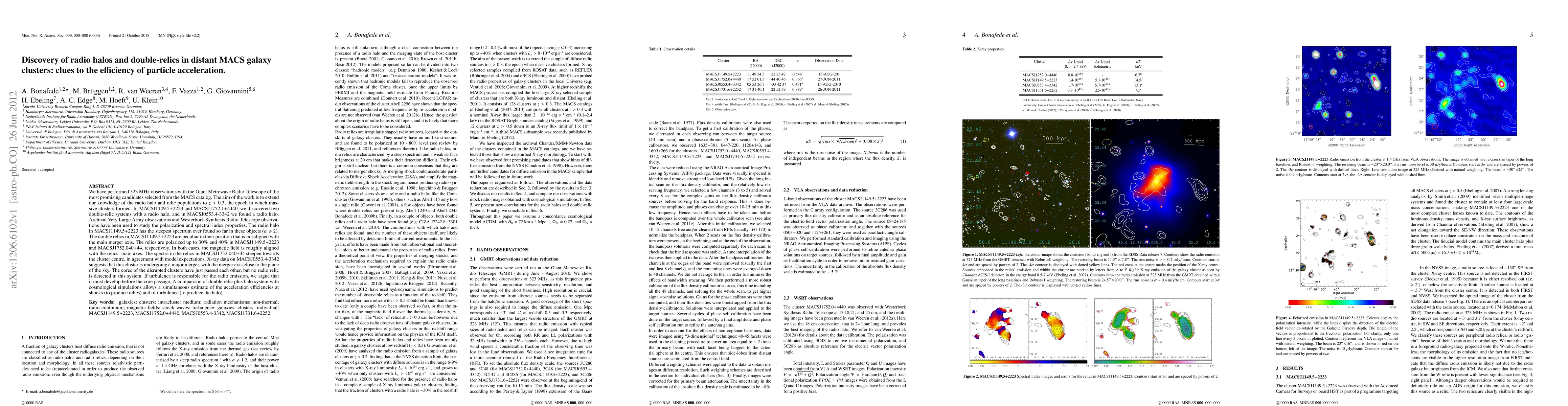 The study, using GMRT and VLBA/WSRT, discovered radio halos and double-relics in three distant galaxy clusters (MACSJ1149.5+2223, MACSJ1752.1+4440, and MACSJ0553.4-3342). Notable findings include a steep-spectrum halo in MACSJ1149.5+2223, misaligned double relics with merger axes, high polarization levels, and cluster merger evidence. The research suggests that particle acceleration mechanisms, likely driven by turbulence, function before core passage in major mergers, providing insights into cluster formation and particle acceleration efficiencies.
