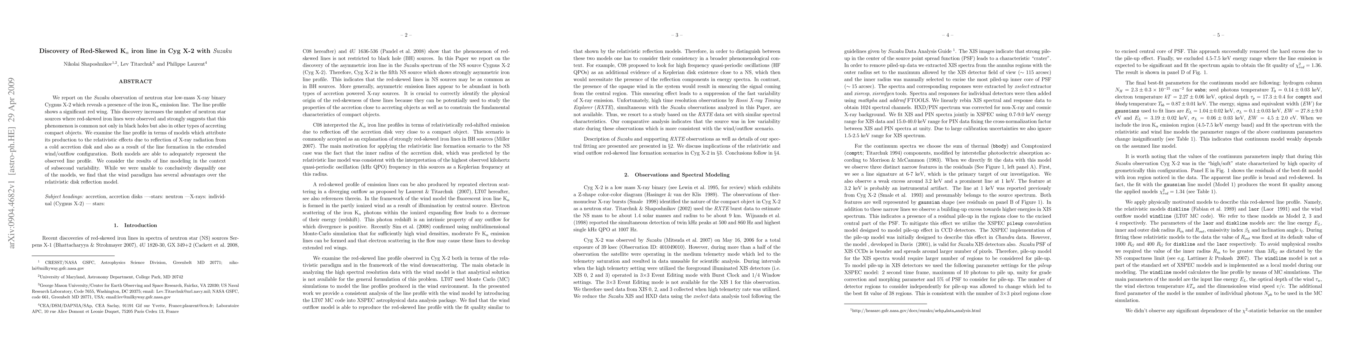 We report on the Suzaku observation of neutron star low-mass X-ray binary Cygnus X-2 which reveals a presence of the iron K_alpha emission line. The line profile shows a significant red wing. This discovery increases the number of neutron star sources where red-skewed iron lines were observed and strongly suggests that this phenomenon is common not only in black holes but also in other types of accreting compact objects. We examine the line profile in terms of models which attribute its production to the relativistic effects due to reflection of X-ray radiation from a cold accretion disk and also as a result of the line formation in the extended wind/outflow configuration. Both models are able to adequately represent the observed line profile. We consider the results of line modeling in the context of subsecond variability. While we were unable to conclusively disqualify one of the models, we find that the wind paradigm has several advantages over the relativistic disk reflection model.