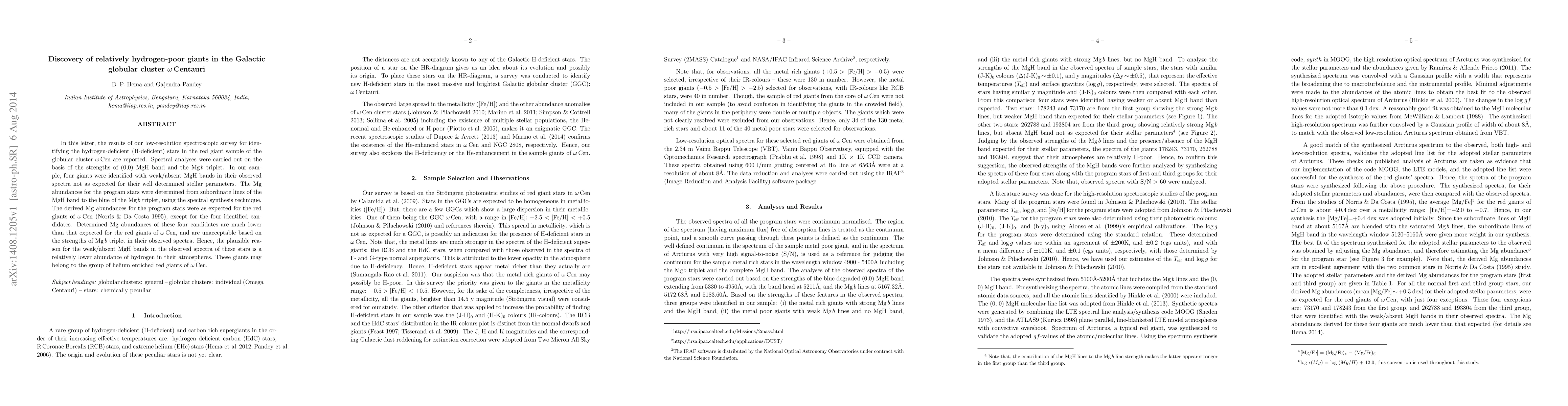 This paper reports the discovery of four hydrogen-poor giants in the globular cluster Omega Centauri, identified through low-resolution spectroscopy. The stars exhibit weak/absent MgH bands, suggesting a lower hydrogen abundance, potentially indicating they belong to a group of helium-enriched red giants.