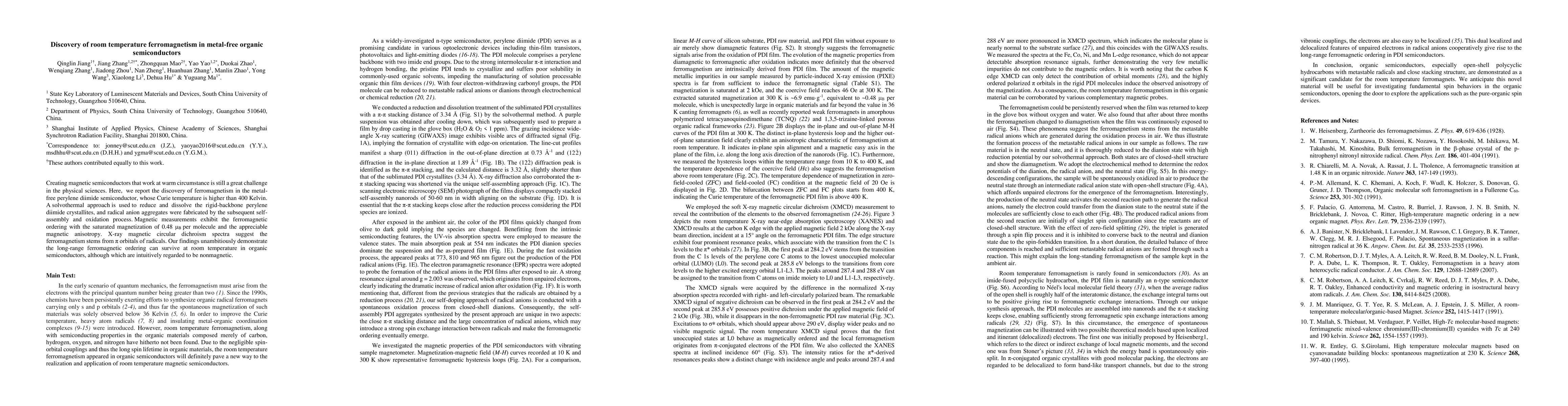 This paper reports the discovery of room temperature ferromagnetism in metal-free perylene diimide semiconductors, achieved via a solvothermal reduction process and self-assembly, with a Curie temperature exceeding 400 K. The ferromagnetism originates from the $\pi$ orbitals of radical anion aggregates, marking a significant breakthrough in magnetic organic semiconductors.