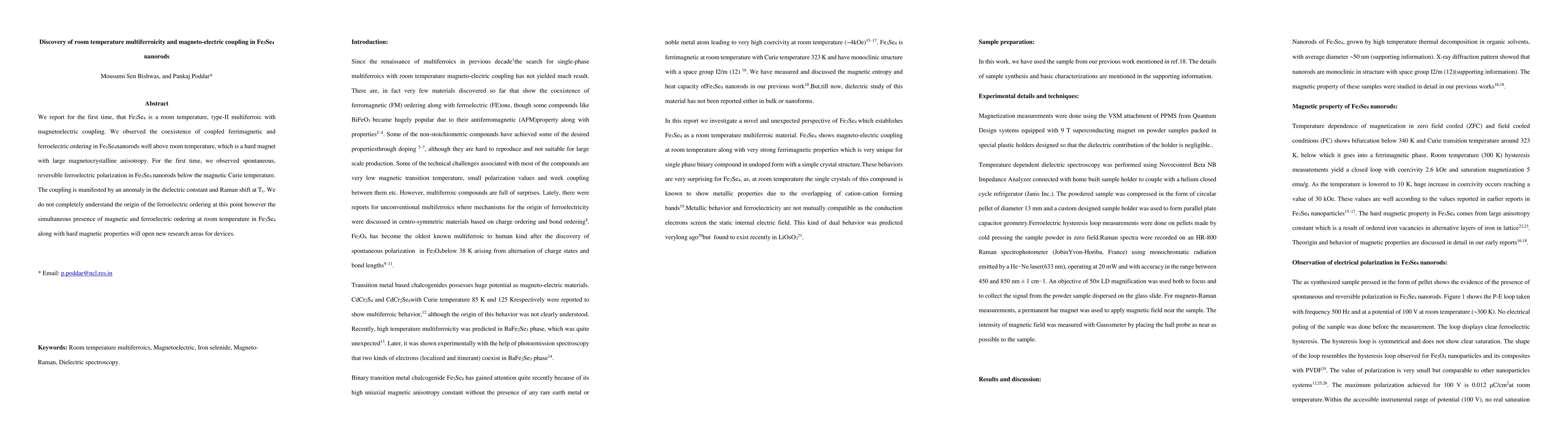 Scientists discovered room temperature multiferroicity in Fe3Se4 nanorods, a material that exhibits both magnetic and ferroelectric properties simultaneously above 0°C, and shows promise for new device applications.