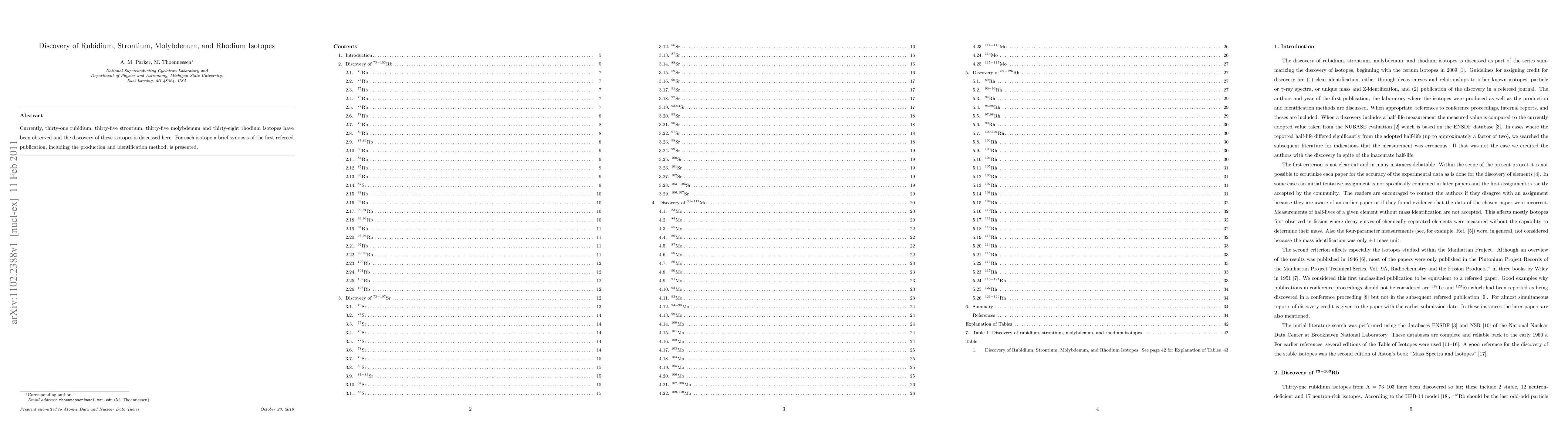 This paper reports the discovery of thirty-one rubidium, thirty-five strontium, thirty-five molybdenum, and thirty-eight rhodium isotopes, detailing the production and identification methods used in their first refereed publications.