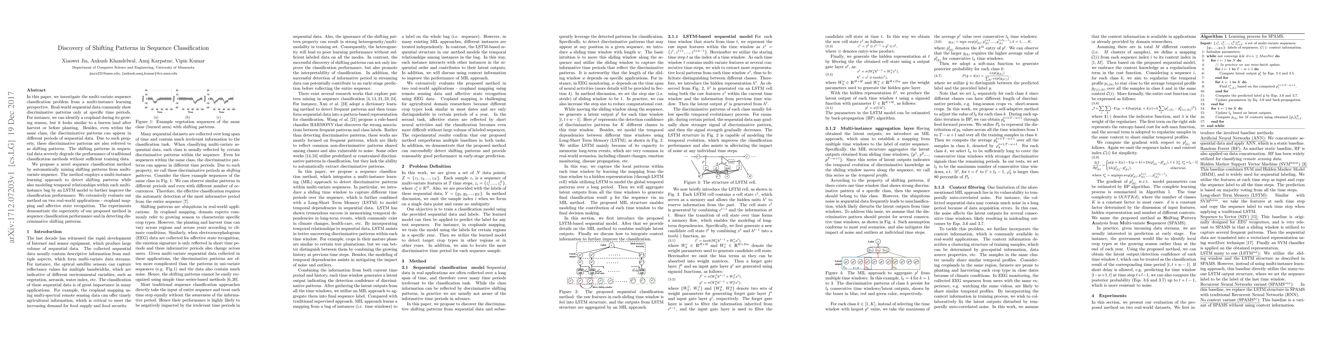 This paper proposes a novel sequence classification method that leverages multi-instance learning to detect shifting patterns in multi-variate sequences, employing an LSTM to model temporal relationships. The method outperforms traditional methods in real-world applications like cropland mapping and affective state recognition.
