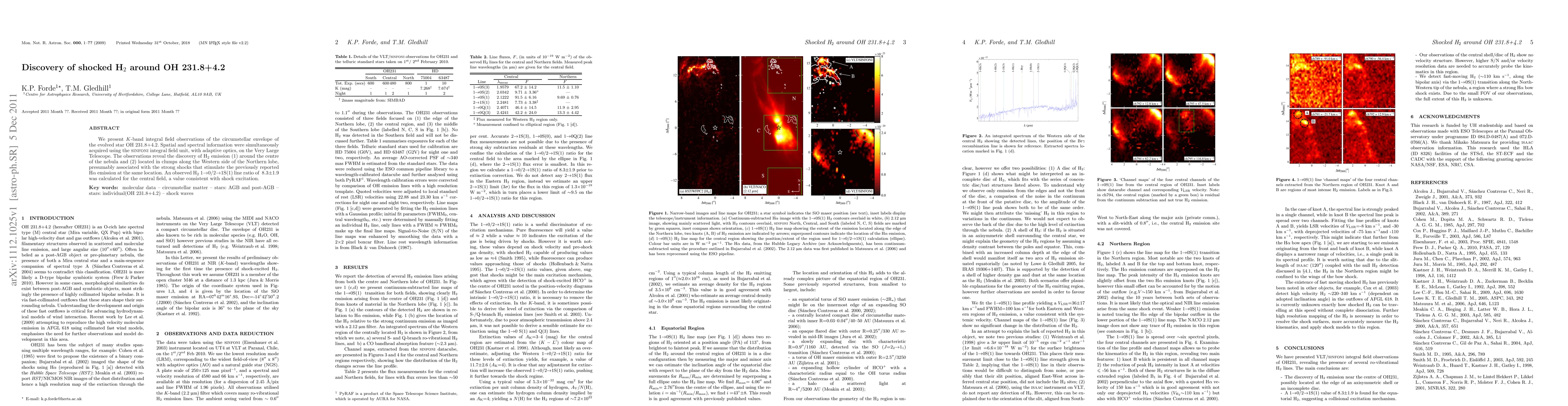 We present K-band integral field observations of the circumstellar envelope of the evolved star OH 231.8+4.2. Spatial and spectral information were simultaneously acquired using the Sinfoni integral field unit, with adaptive optics, on the Very Large Telescope. The observations reveal the discovery of H2 emission (1) around the centre of the nebula and (2) located in clumps along the Western side of the Northern lobe, presumably associated with the strong shocks that stimulate the previously reported H-alpha emission at the same location. An observed H2 1-0/2-1S(1) line ratio of 8.3+/-1.9 was calculated for the central field, a value consistent with shock excitation.