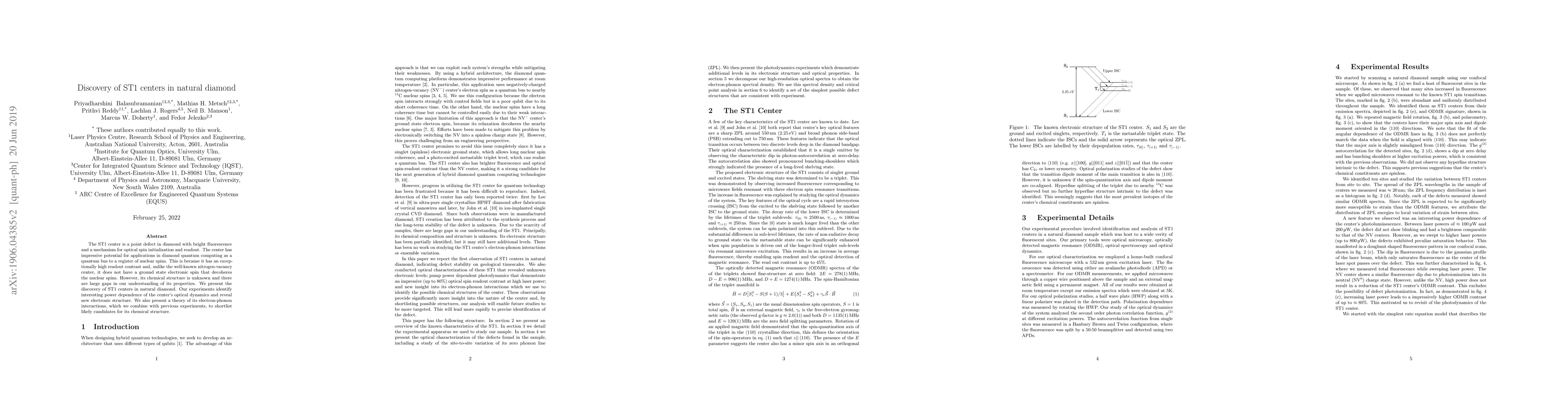 The ST1 center is a point defect in diamond with bright fluorescence and a mechanism for optical spin initialization and readout. The center has impressive potential for applications in diamond quantum computing as a quantum bus to a register of nuclear spins. This is because it has an exceptionally high readout contrast and, unlike the well-known nitrogen-vacancy center, it does not have a ground state electronic spin that decoheres the nuclear spins. However, its chemical structure is unknown and there are large gaps in our understanding of its properties. We present the discovery of ST1 centers in natural diamond. Our experiments identify interesting power dependence of the center's optical dynamics and reveal new electronic structure. We also present a theory of its electron-phonon interactions, which we combine with previous experiments, to shortlist likely candidates for its chemical structure.