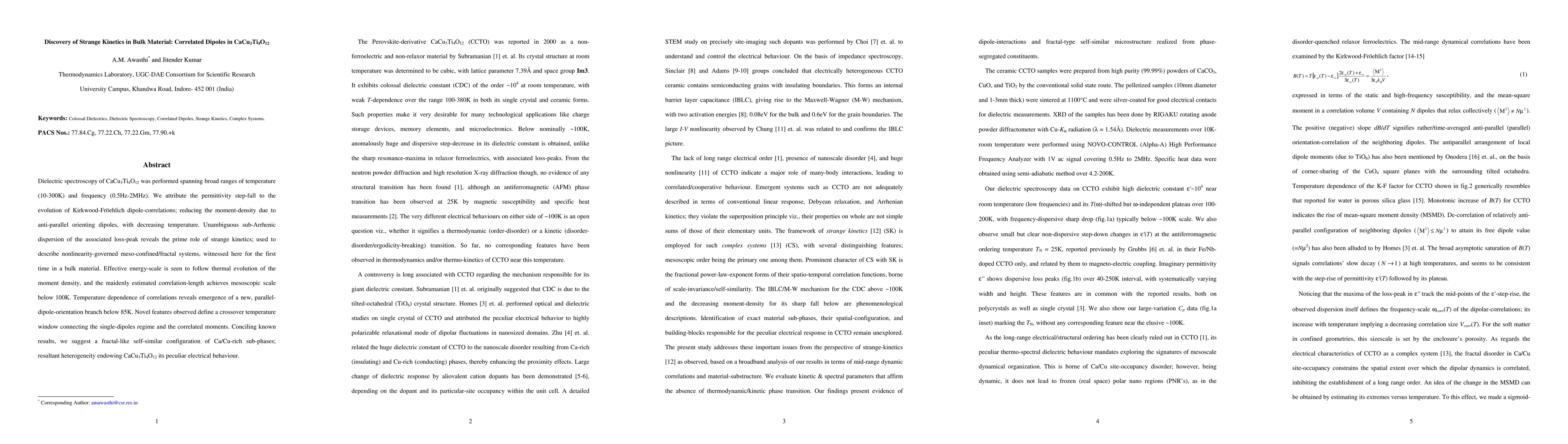Dielectric spectroscopy of CaCu3Ti4O12 was performed spanning broad ranges of temperature (10-300K) and frequency (0.5Hz-2MHz). We attribute the permittivity step-fall to the evolution of Kirkwood-Fr\"oehlich dipole-correlations; reducing the moment-density due to anti-parallel orienting dipoles, with decreasing temperature. Unambiguous sub-Arrhenic dispersion of the associated loss-peak reveals the prime role of strange kinetics; used to describe nonlinearity-governed meso-confined/fractal systems, witnessed here for the first time in a bulk material. Effective energy-scale is seen to follow thermal evolution of the moment density, and the maidenly estimated correlation-length achieves mesoscopic scale below 100K. Temperature dependence of correlations reveals emergence of a new, parallel-dipole-orientation branch below 85K. Novel features observed define a crossover temperature window connecting the single-dipoles regime and the correlated moments. Conciling known results, we suggest a fractal-like self-similar configuration of Ca/Cu-rich sub-phases; resultant heterogeneity endowing CaCu3Ti4O12 its peculiar electrical behaviour.