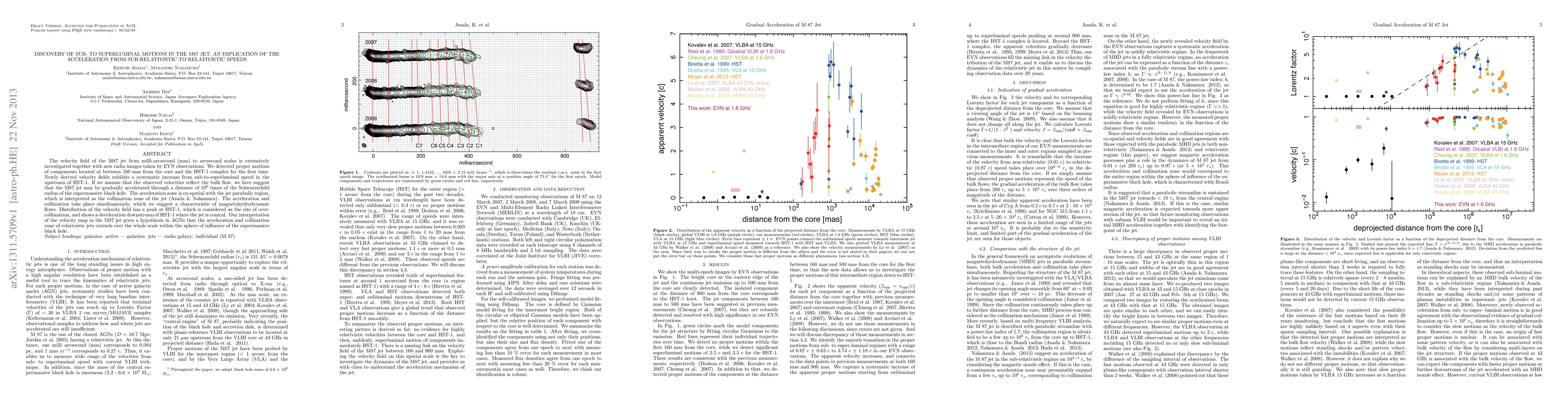 This study investigates the velocity field of the M87 jet using EVN observations, revealing sub- to superluminal motions and detecting proper motions for the first time. The findings suggest that the jet accelerates from sub-relativistic to relativistic speeds over a distance of 10^6 Schwarzschild radii, indicating simultaneous acceleration and collimation characteristic of magnetohydrodynamic flows.