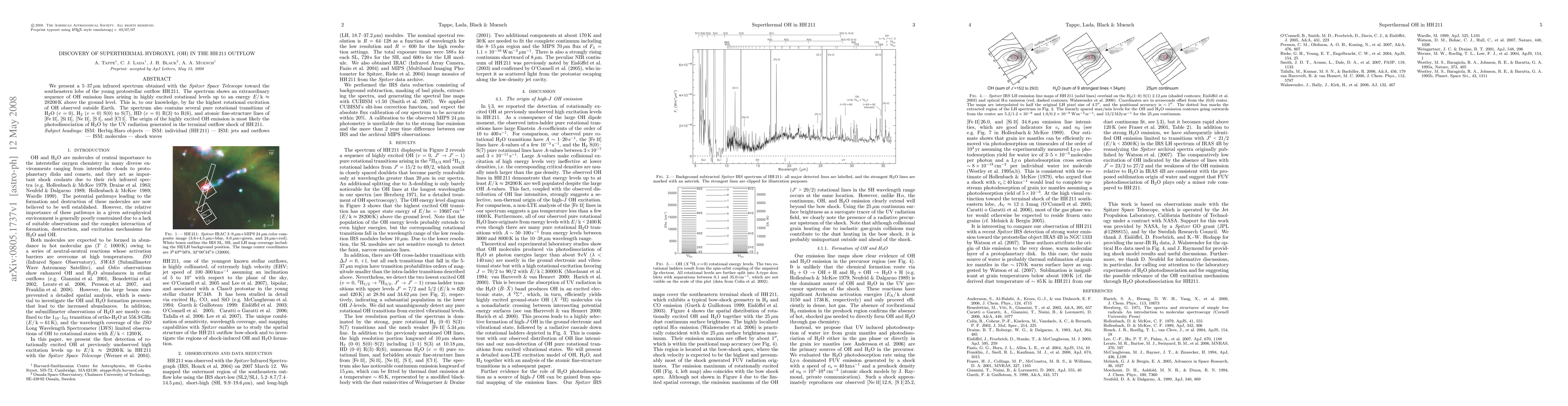 We present a 5-37 micron infrared spectrum obtained with the Spitzer Space Telescope toward the southeastern lobe of the young protostellar outflow HH211. The spectrum shows an extraordinary sequence of OH emission lines arising in highly excited rotational levels up to an energy E/k~28200K above the ground level. This is, to our knowledge, by far the highest rotational excitation of OH observed outside Earth. The spectrum also contains several pure rotational transitions of H2O (v=0), H2 (v=0) S(0) to S(7), HD (v=0) R(3) to R(6), and atomic fine-structure lines of [Fe II], [Si II], [Ne II], [S I], and [Cl I]. The origin of the highly excited OH emission is most likely the photodissociation of H2O by the UV radiation generated in the terminal outflow shock of HH211.