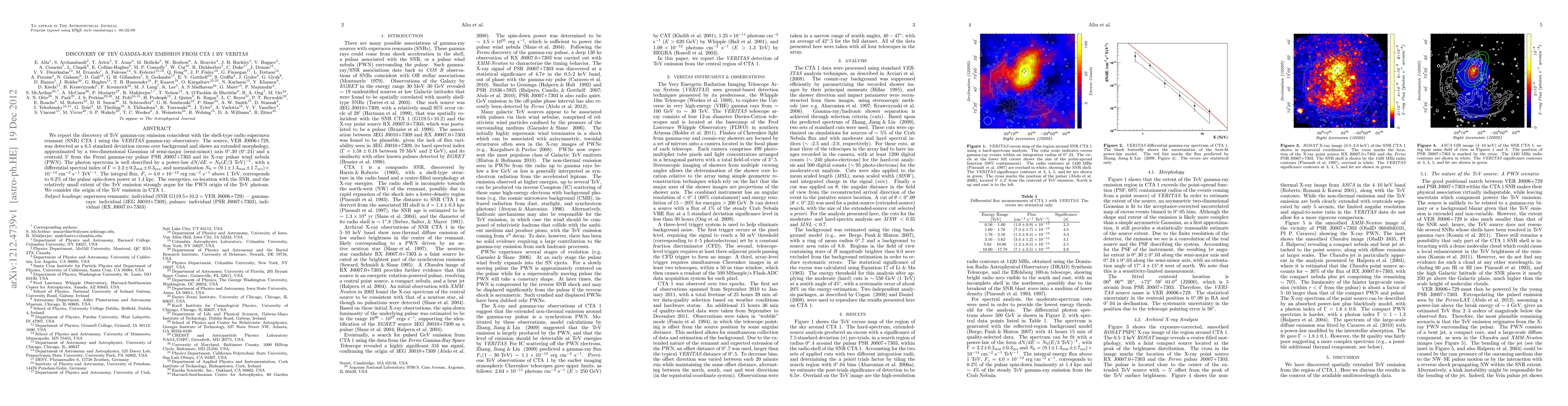 The VERITAS observatory discovered TeV gamma-ray emission from the shell-type radio supernova remnant CTA 1, identified as VER J0006+729, with an extended morphology and a power-law spectrum. The emission likely originates from the pulsar wind nebula associated with PSR J0007+7303.