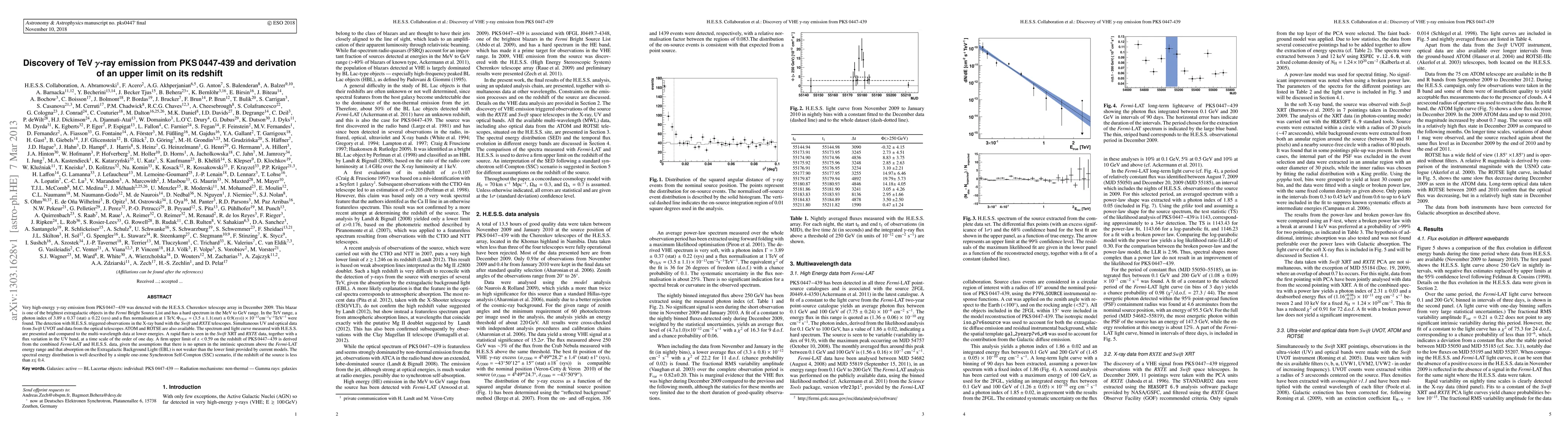 Scientists detected TeV gamma-ray emission from PKS 0447-439 using H.E.S.S. telescope array, revealing a photon index of 3.89 and flux normalization at 1 TeV, and set an upper limit on the blazar's redshift at z < 0.59.