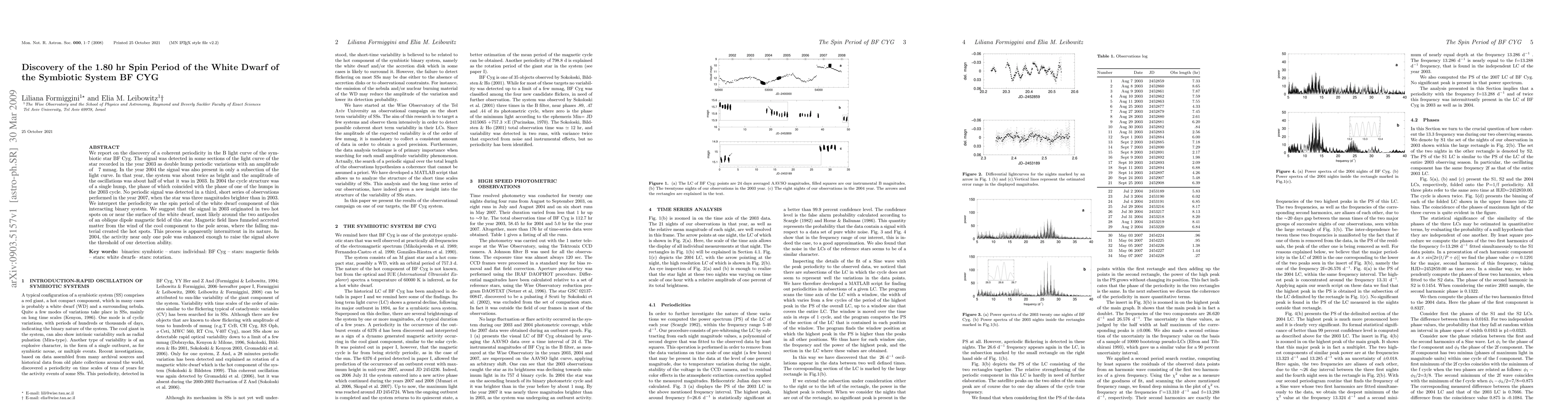 We report on the discovery of a coherent periodicity in the B light curve of the symbiotic star BF Cyg. The signal was detected in some sections of the light curve of the star recorded in the year 2003 as double hump periodic variations with an amplitude of ~7 mmag. In the year 2004 the signal was also present in only a subsection of the light curve. In that year, the system was about twice as bright and the amplitude of the oscillations was about half of what it was in 2003. In 2004 the cycle structure was of a single hump, the phase of which coincided with the phase of one of the humps in the 2003 cycle. No periodic signal was detected in a third, short series of observations performed in the year 2007, when the star was three magnitudes brighter than in 2003. We interpret the periodicity as the spin period of the white dwarf component of this interacting binary system. We suggest that the signal in 2003 originated in two hot spots on or near the surface of the white dwarf, most likely around the two antipodes of an oblique dipole magnetic field of this star. Magnetic field lines funneled accreted matter from the wind of the cool component to the pole areas, where the falling material created the hot spots. This process is apparently intermittent in its nature. In 2004, the activity near only one pole was enhanced enough to raise the signal above the threshold of our detection ability.