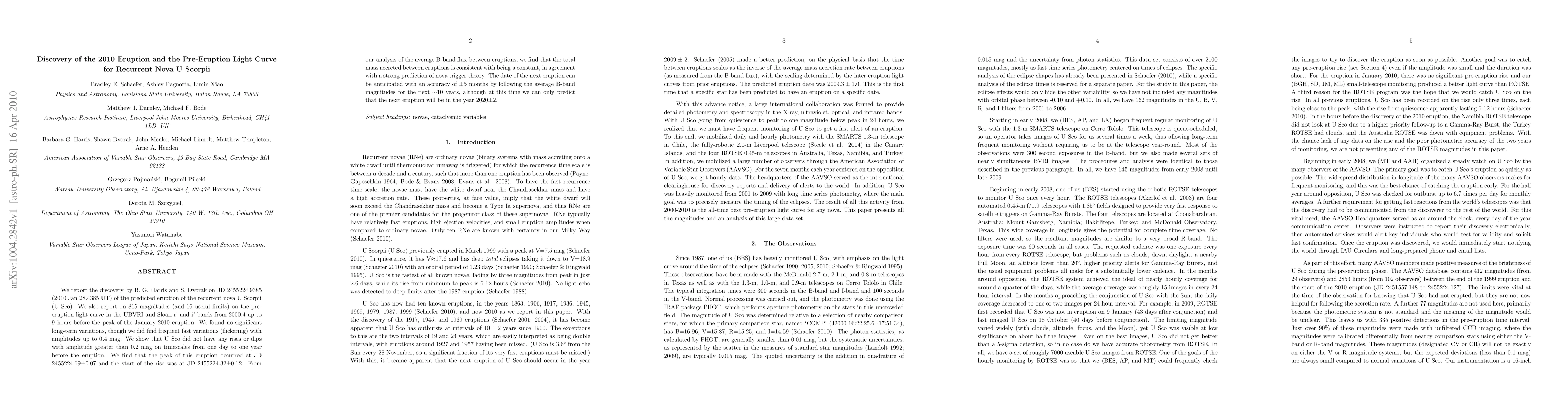 We report the discovery by B. G. Harris and S. Dvorak on JD 2455224.9385 (2010 Jan 28.4385 UT) of the predicted eruption of the recurrent nova U Scorpii (U Sco). We also report on 815 magnitudes (and 16 useful limits) on the pre-eruption light curve in the UBVRI and Sloan r' and i' bands from 2000.4 up to 9 hours before the peak of the January 2010 eruption. We found no significant long-term variations, though we did find frequent fast variations (flickering) with amplitudes up to 0.4 mag. We show that U Sco did not have any rises or dips with amplitude greater than 0.2 mag on timescales from one day to one year before the eruption. We find that the peak of this eruption occurred at JD 2455224.69+-0.07 and the start of the rise was at JD 2455224.32+-0.12. From our analysis of the average B-band flux between eruptions, we find that the total mass accreted between eruptions is consistent with being a constant, in agreement with a strong prediction of nova trigger theory. The date of the next eruption can be anticipated with an accuracy of +-5 months by following the average B-band magnitudes for the next ~10 years, although at this time we can only predict that the next eruption will be in the year 2020+-2.