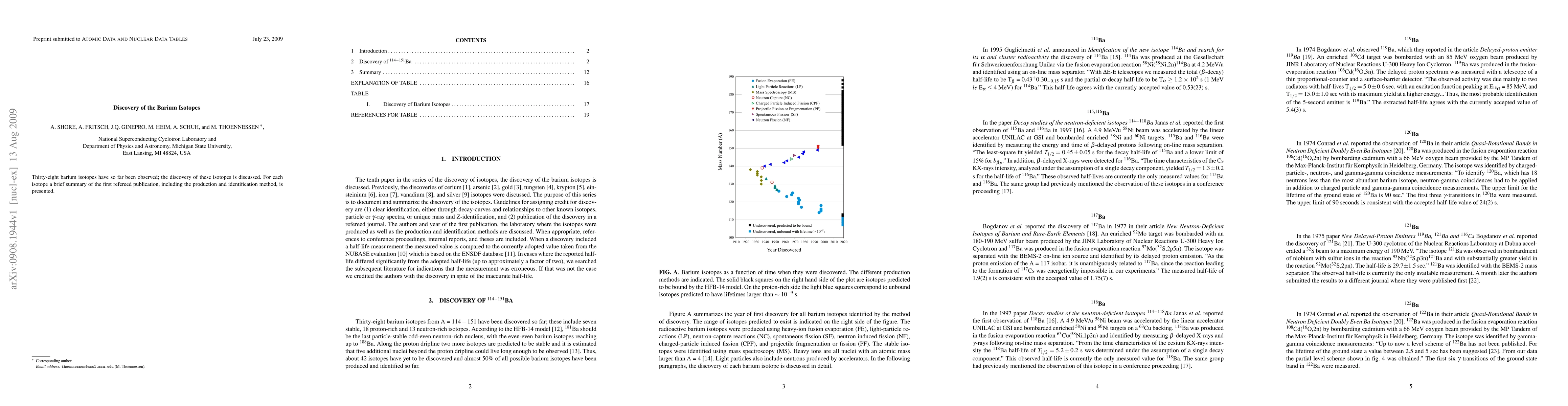Thirty-eight barium isotopes have so far been observed; the discovery of these isotopes is discussed. For each isotope a brief summary of the first refereed publication, including the production and identification method, is presented.