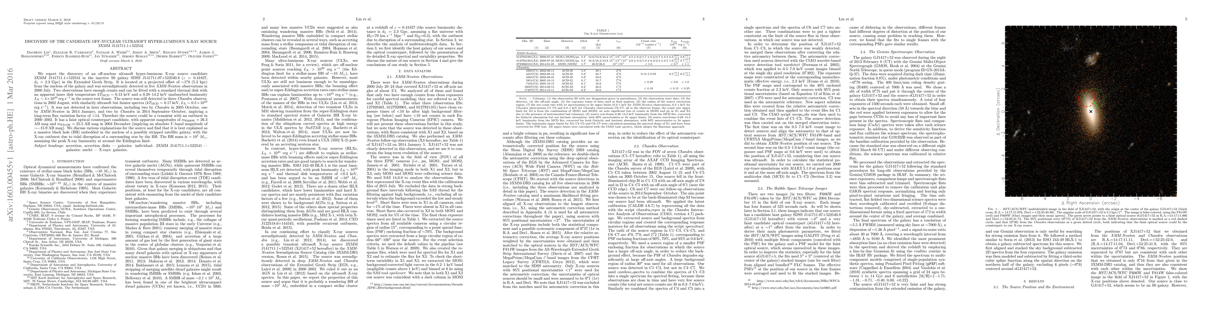 The paper reports the discovery of an ultrasoft hyper-luminous X-ray source, 3XMM J141711.1+522541, in an inactive S0 galaxy, suggesting it may be a transient massive black hole from a disrupted satellite. The source shows significant flux variation and a faint optical counterpart.