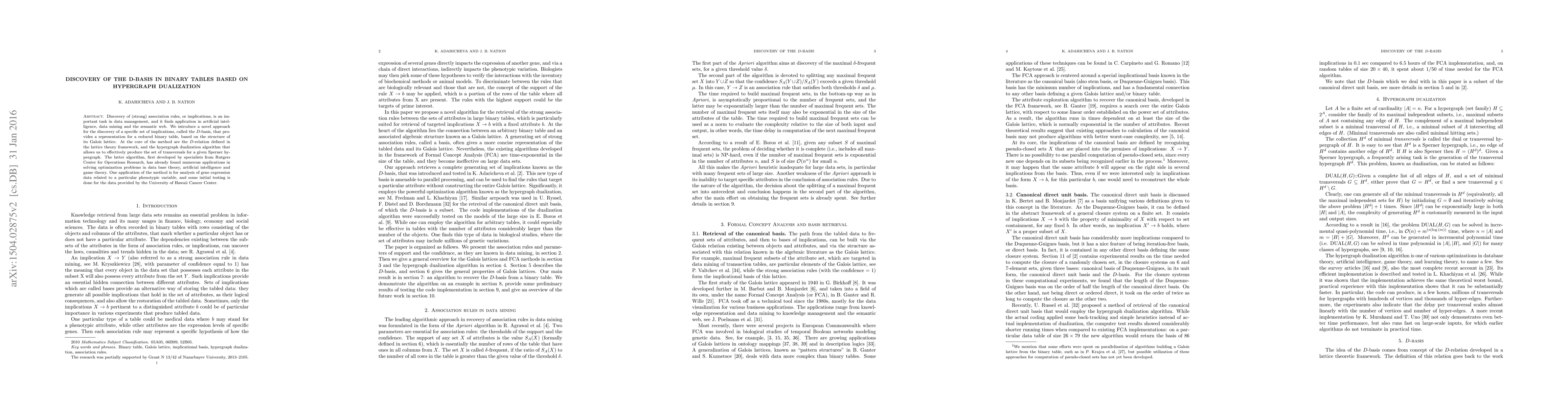 This paper proposes a novel method for discovering a $D$-basis of association rules in binary tables using lattice theory and hypergraph dualization, aiming to represent the reduced binary table. The method leverages the $D$-relation and a hypergraph dualization algorithm to identify significant implications, with applications in data mining and analysis of gene expression data.