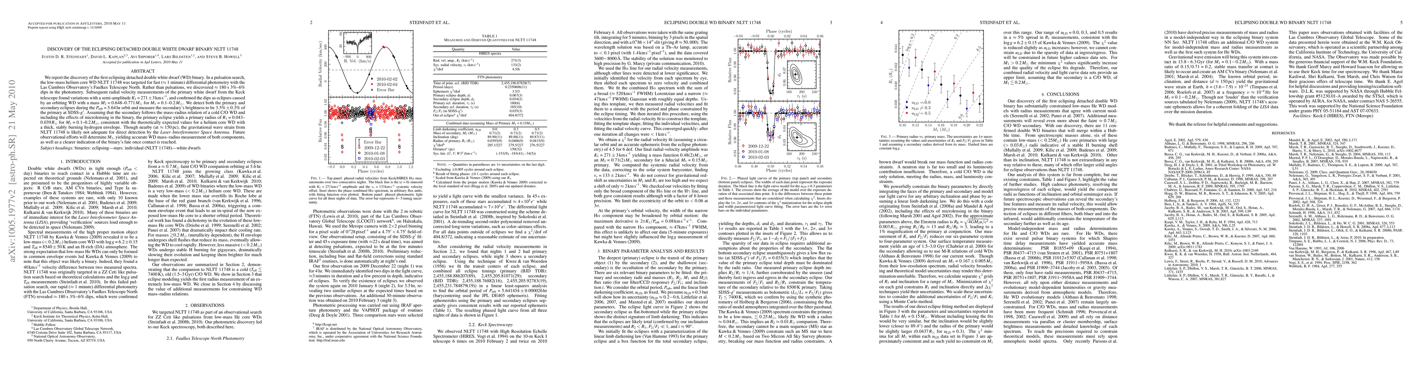 Researchers discovered the first eclipsing detached double white dwarf binary, NLTT 11748, using differential photometry and radial velocity measurements. The system comprises a low-mass helium core white dwarf and a more massive companion, with future observations expected to provide precise mass-radius measurements and insights into the binary's evolution.