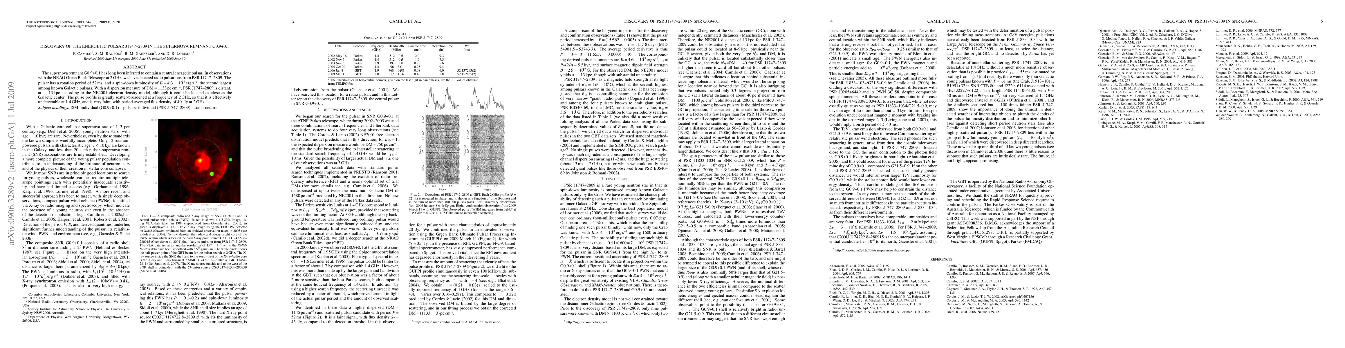 Researchers detected the energetic pulsar PSR J1747-2809 in the supernova remnant G0.9+0.1 using the NRAO Green Bank Telescope, revealing it to have a rotation period of 52 ms and a high spin-down luminosity of 4.3e37 erg/s. The pulsar is distant, estimated at ~13 kpc, with a scatter-broadened pulse profile at 2 GHz.