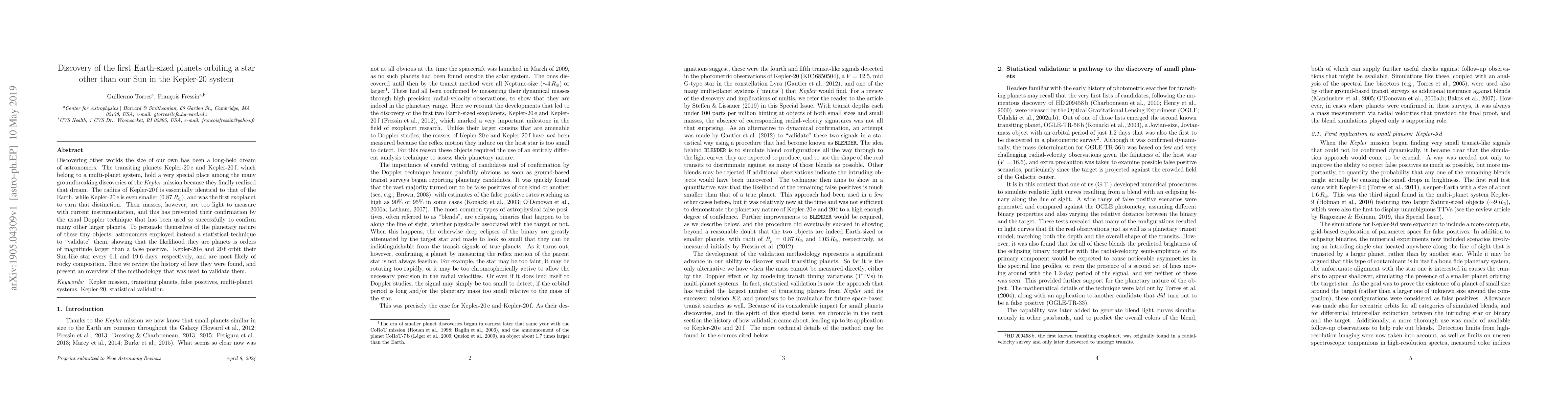 Discovering other worlds the size of our own has been a long-held dream of astronomers. The transiting planets Kepler-20e and Kepler-20f, which belong to a multi-planet system, hold a very special place among the many groundbreaking discoveries of the Kepler mission because they finally realized that dream. The radius of Kepler-20f is essentially identical to that of the Earth, while Kepler-20e is even smaller (0.87 R[Earth]), and was the first exoplanet to earn that distinction. Their masses, however, are too light to measure with current instrumentation, and this has prevented their confirmation by the usual Doppler technique that has been used so successfully to confirm many other larger planets. To persuade themselves of the planetary nature of these tiny objects, astronomers employed instead a statistical technique to "validate" them, showing that the likelihood they are planets is orders of magnitude larger than a false positive. Kepler-20e and 20f orbit their Sun-like star every 6.1 and 19.6 days, respectively, and are most likely of rocky composition. Here we review the history of how they were found, and present an overview of the methodology that was used to validate them.