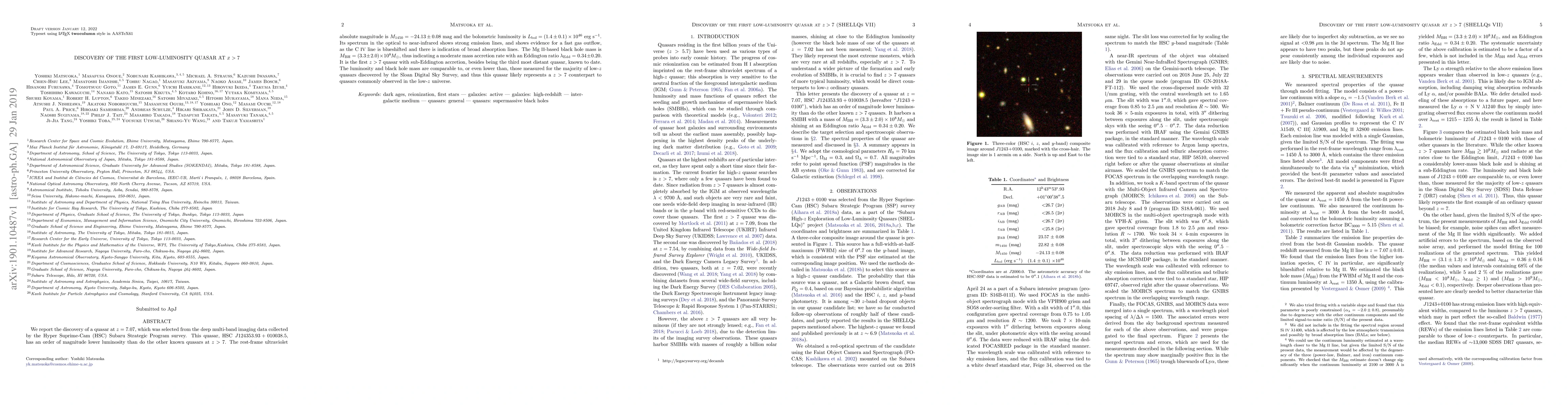 This paper reports the discovery of a low-luminosity quasar at z = 7.07, identified in deep imaging data from the HSC Subaru survey. The quasar exhibits a significantly lower luminosity compared to other z > 7 quasars, with a black hole mass of (3.3 ± 2.0) x 10^8 Msun, indicating a moderate accretion rate.