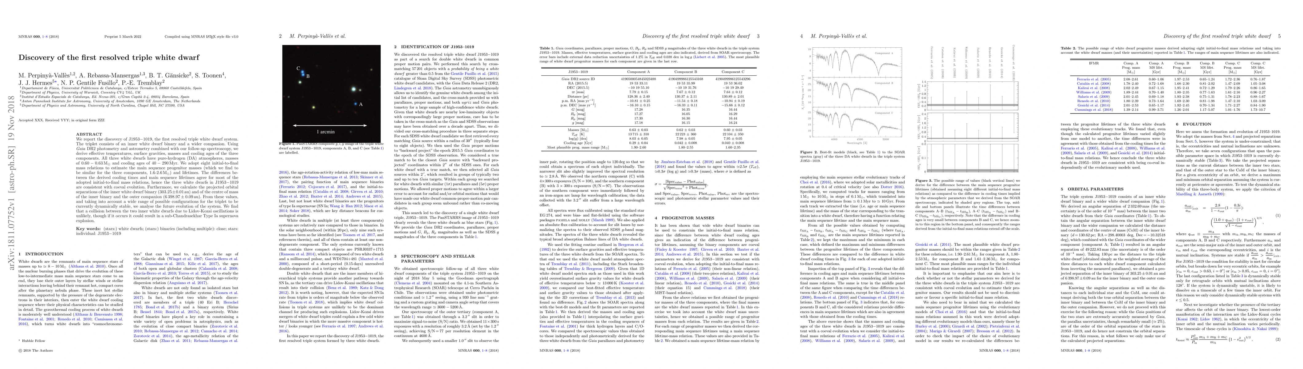 We report the discovery of J1953-1019, the first resolved triple white dwarf system. The triplet consists of an inner white dwarf binary and a wider companion. Using Gaia DR2 photometry and astrometry combined with our follow-up spectroscopy, we derive effective temperatures, surface gravities, masses and cooling ages of the three components. All three white dwarfs have pure-hydrogen (DA) atmospheres, masses of 0.60-0.63 Msun and cooling ages of 40-290 Myr. We adopt eight initial-to-final mass relations to estimate the main sequence progenitor masses (which we find to be similar for the three components, 1.6-2.6 Msun) and lifetimes. The differences between the derived cooling times and main sequence lifetimes agree for most of the adopted initial-to-final mass relations, hence the three white dwarfs in J1953-1019 are consistent with coeval evolution. Furthermore, we calculate the projected orbital separations of the inner white dwarf binary (303.25 +- 0.01 au) and of the centre of mass of the inner binary and the outer companion (6398.97 +- 0.09 au). From these values, and taking into account a wide range of possible configurations for the triplet to be currently dynamically stable, we analyse the future evolution of the system. We find that a collision between the two inner white dwarfs due to Lidov-Kozai oscillations is unlikely, though if it occurs it could result in a sub-Chandrasekhar Type Ia supernova explosion.