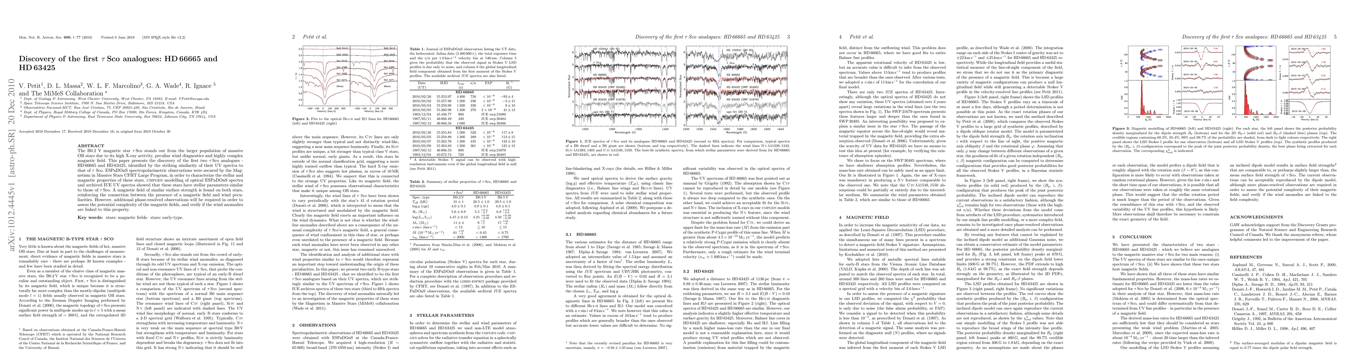 The B0.2 V magnetic star tau Sco stands out from the larger population of massive OB stars due to its high X-ray activity, peculiar wind diagnostics and highly complex magnetic field. This paper presents the discovery of the first two tau Sco analogues - HD 66665 and HD 63425, identified by the striking similarity of their UV spectra to that of tau Sco. ESPaDOnS spectropolarimetric observations were secured by the Magnetism in Massive Stars CFHT Large Program, in order to characterize the stellar and magnetic properties of these stars. CMFGEN modelling of optical ESPaDOnS spectra and archived IUE UV spectra showed that these stars have stellar parameters similar to those of tau Sco. A magnetic field of similar surface strength is found on both stars, reinforcing the connection between the presence of a magnetic field and wind peculiarities. However, additional phase-resolved observations will be required in order to assess the potential complexity of the magnetic fields, and verify if the wind anomalies are linked to this property.