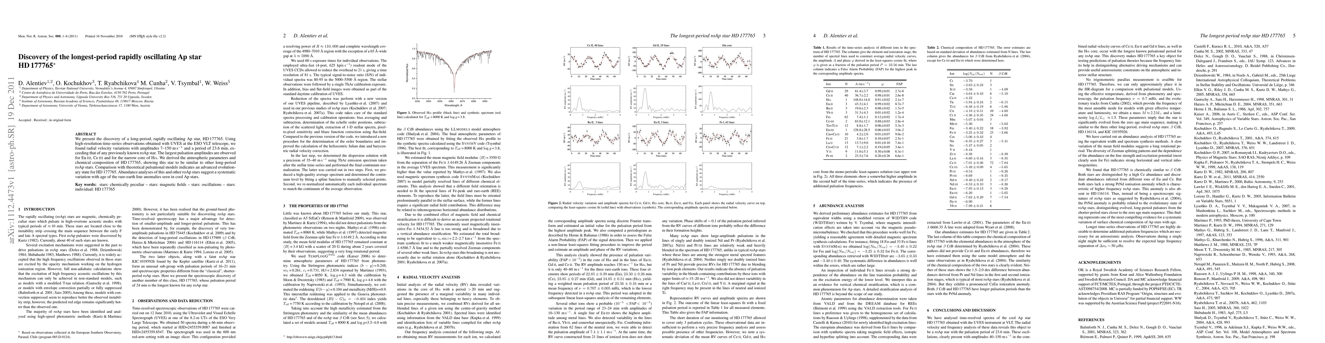 Summary: Researchers discovered HD177765, the longest-period rapidly oscillating Ap star, with radial velocity variations and a 23.6-minute period. The study reveals advanced evolutionary state and systematic variation in rare-earth line anomalies with age in roAp stars.
