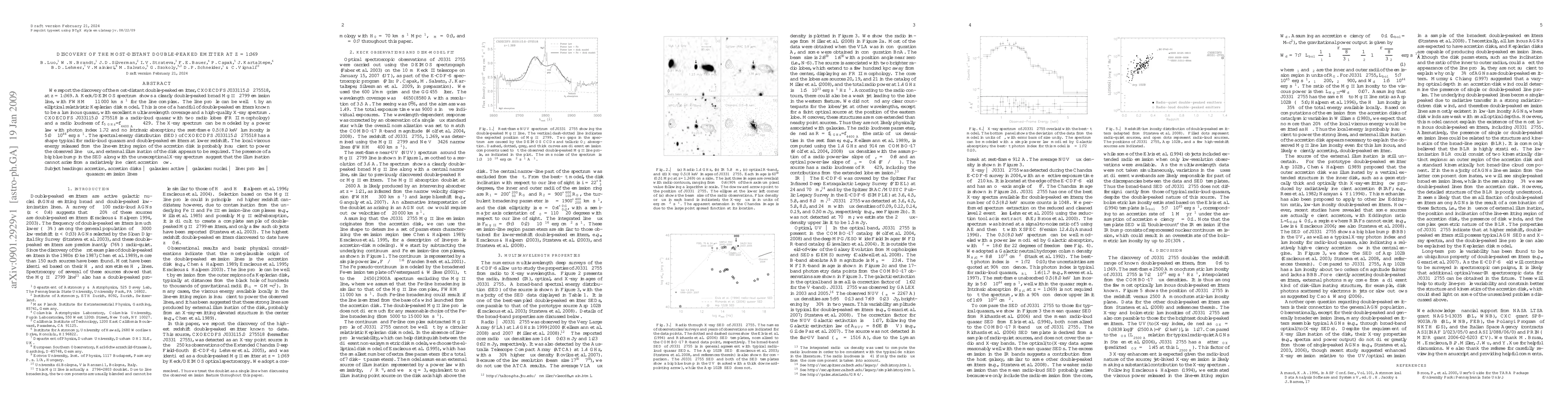 This paper reports the discovery of the most-distant double-peaked emitter, CXOECDFS J033115.0-275518, at z=1.369, characterized by a broad Mg II emission line, fitting well to an elliptical relativistic disk model. The quasar exhibits radio-loud FR II morphology and a high-quality X-ray spectrum, suggesting external illumination of the accretion disk.