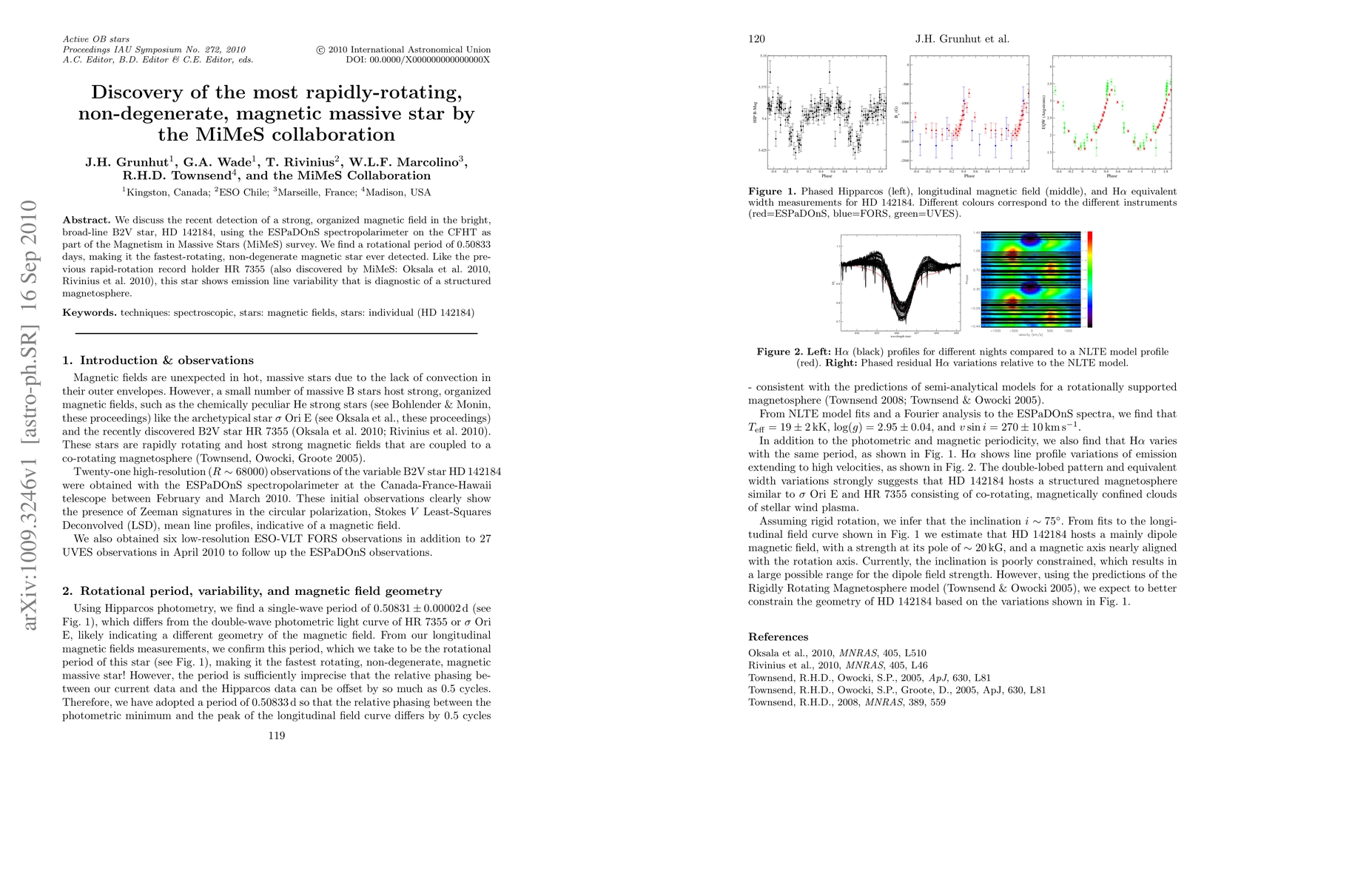 Summary: The MiMeS collaboration detected a B2V star, HD 142184, with a rotational period of 0.50833 days, making it the fastest-rotating, non-degenerate magnetic star known. The star exhibits strong, organized magnetic fields and emission line variability indicative of a structured magnetosphere.