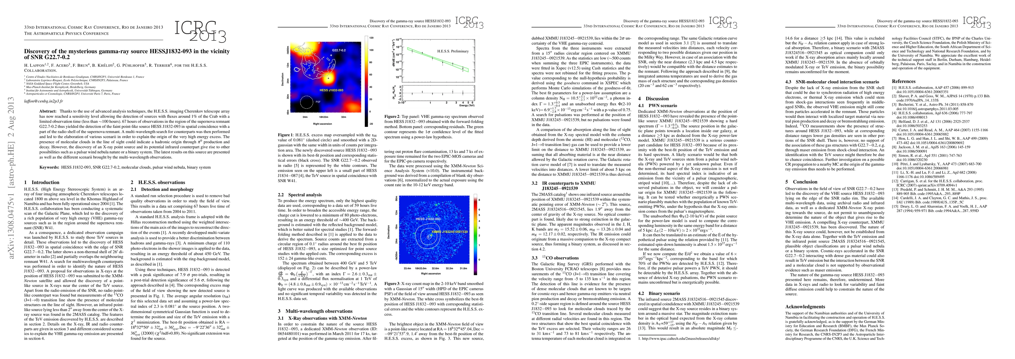 The H.E.S.S. telescope array detected the faint gamma-ray source HESS J1832-093 near the supernova remnant G22.7-0.2, sparking various scenarios for its origin, including hadronic processes or a pulsar wind nebula, based on multi-wavelength observations.