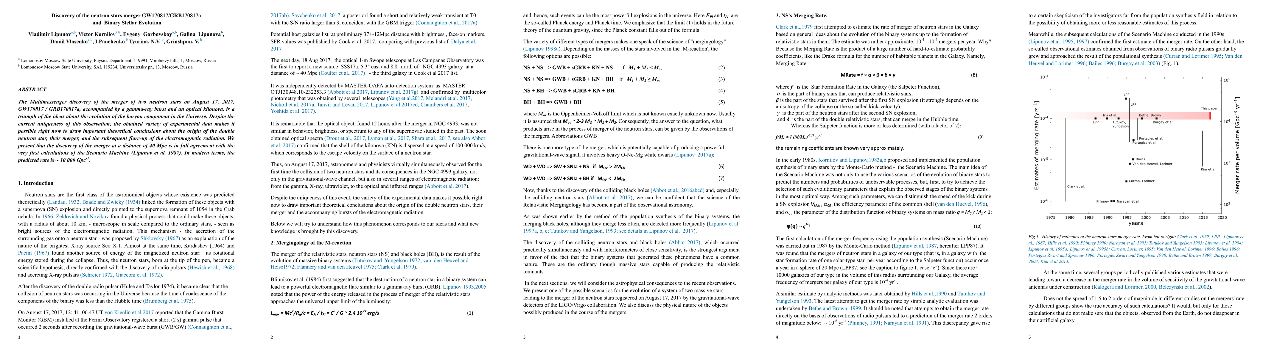 The Multimessenger discovery of the merger of two neutron stars on August 17, 2017, GW170817 / GRB170817A, accompanied by a gamma-ray burst and an optical kilonova, is a triumph of the ideas about the evolution of the baryon component in the Universe. Despite the current uniqueness of this observation, the obtained variety of experimental data makes it possible right now to draw important theoretical conclusions about the origin of the double neutron star, their merger, and the subsequent flare-up of the electromagnetic radiation. We present that the discovery of the merger at a distance of 40 Mpc is in full agreement with the very first calculations of the Scenario Machine (Lipunov et al. 1987). In modern terms, the predicted rate is ~ 10 000 Gpc-3.