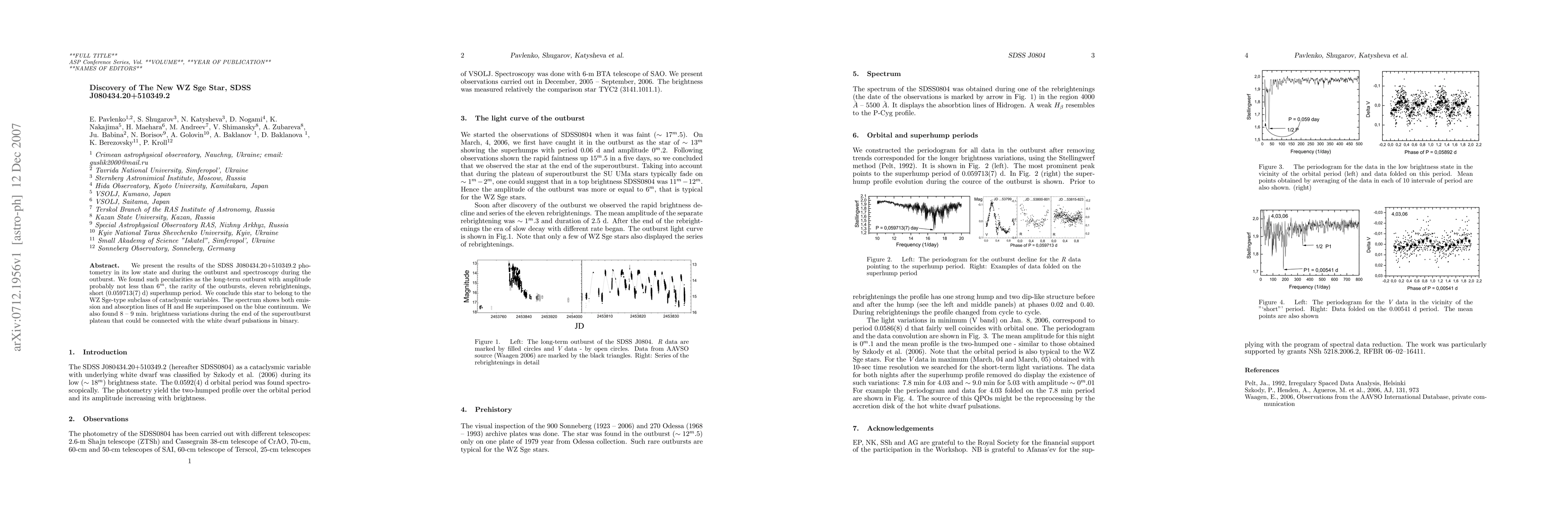 This paper reports the discovery of SDSS J080434.20+510349.2, a new WZ Sge star characterized by a long-term outburst, rare outbursts, and a short superhump period. The star exhibits both emission and absorption lines of H and He, and shows periodic brightness variations likely due to white dwarf pulsations.