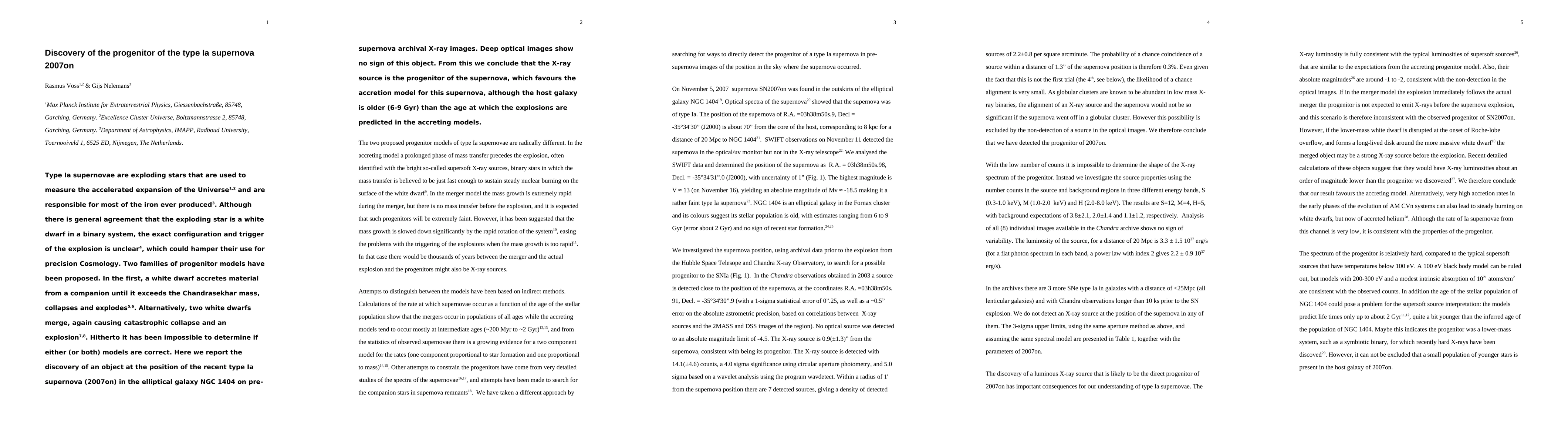 The discovery of an X-ray source in pre-supernova images at the site of type Ia supernova 2007on supports the accretion model for its progenitor, suggesting a white dwarf accreting material from a companion. This finding contrasts with the expected progenitor age in accreting models, raising questions about the underlying explosion mechanisms.