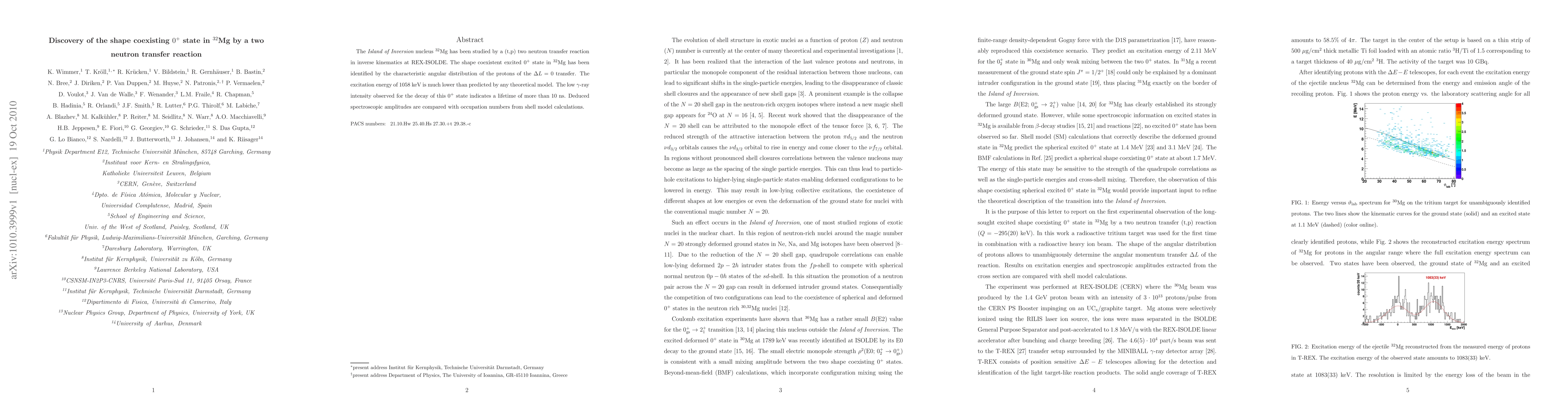 The Island of Inversion nucleus 32Mg has been studied by a (t,p) two neutron transfer reaction in inverse kinematics at REX-ISOLDE. The shape coexistent excited 0+ state in 32Mg has been identified by the characteristic angular distribution of the protons of the DeltaL = 0 transfer. The excitation energy of 1058 keV is much lower than predicted by any theoretical model. The low gamma-ray intensity observed for the decay of this 0+ state indicates a lifetime of more than 10 ns. Deduced spectroscopic amplitudes are compared with occupation numbers from shell model calculations.
