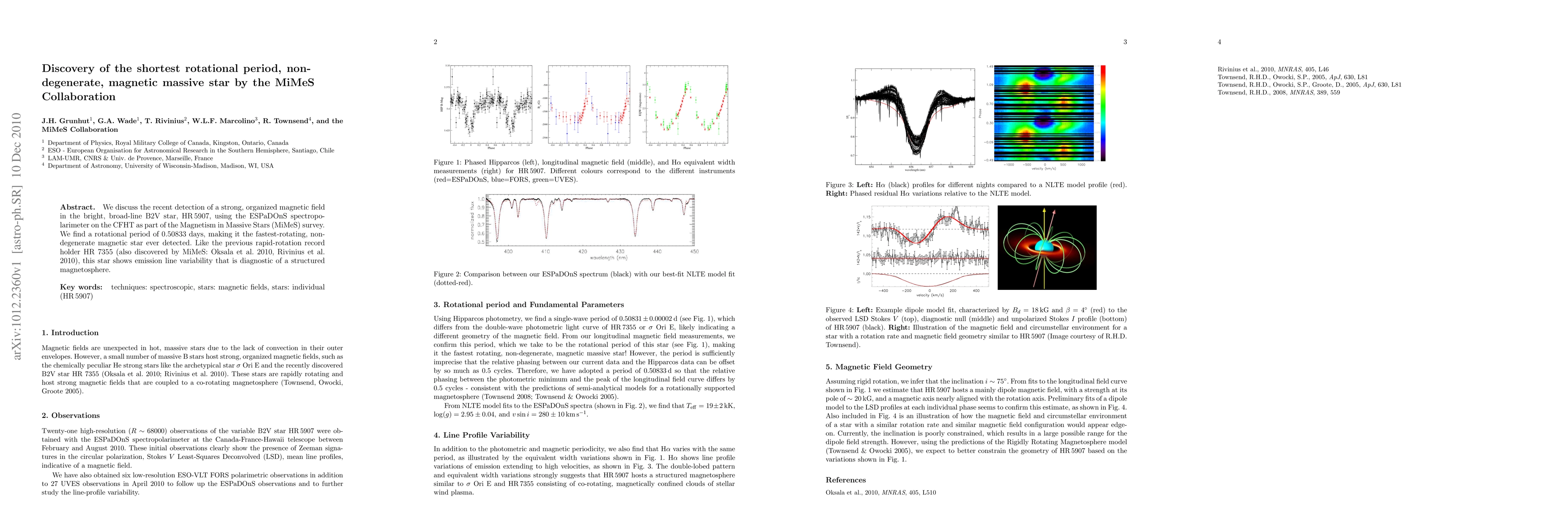 We discuss the recent detection of a strong, organized magnetic field in the bright, broad-line B2V star, HR 5907, using the ESPaDOnS spectropolarimeter on the CFHT as part of the Magnetism in Massive Stars (MiMeS) survey. We find a rotational period of 0.50833 days, making it the fastest-rotating, non-degenerate magnetic star ever detected. Like the previous rapid-rotation record holder HR 7355 (also discovered by MiMeS: Oksala et al. 2010, Rivinius et al. 2010), this star shows emission line variability that is diagnostic of a structured magnetosphere.