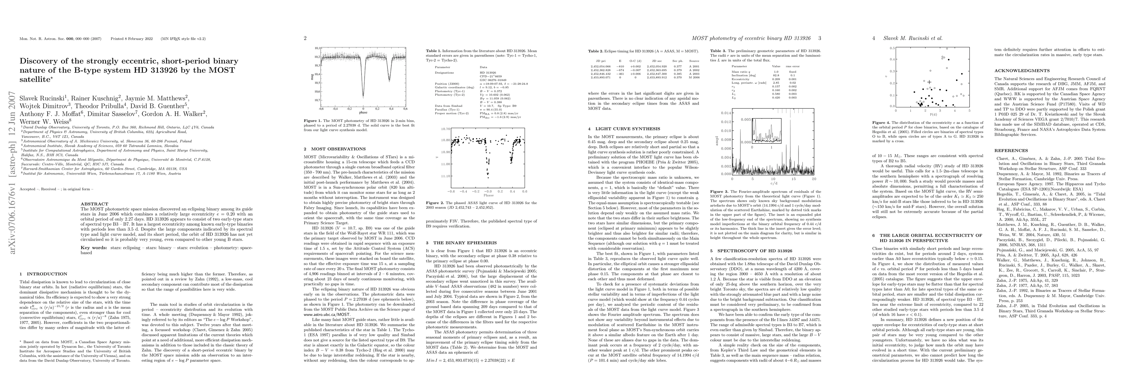 The MOST photometric space mission discovered an eclipsing binary among its guide stars in June 2006 which combines a relatively large eccentricity e = 0.20 with an orbital period of only 2.27 days. HD 313926 appears to consist of two early-type stars of spectral type B3 - B7. It has a largest eccentricity among known early-type binaries with periods less than 3.5 d. Despite the large components indicated by its spectral type and light curve model, and its short period, the orbit of HD 313926 has not yet circularised so it is probably very young, even compared to other young B stars.
