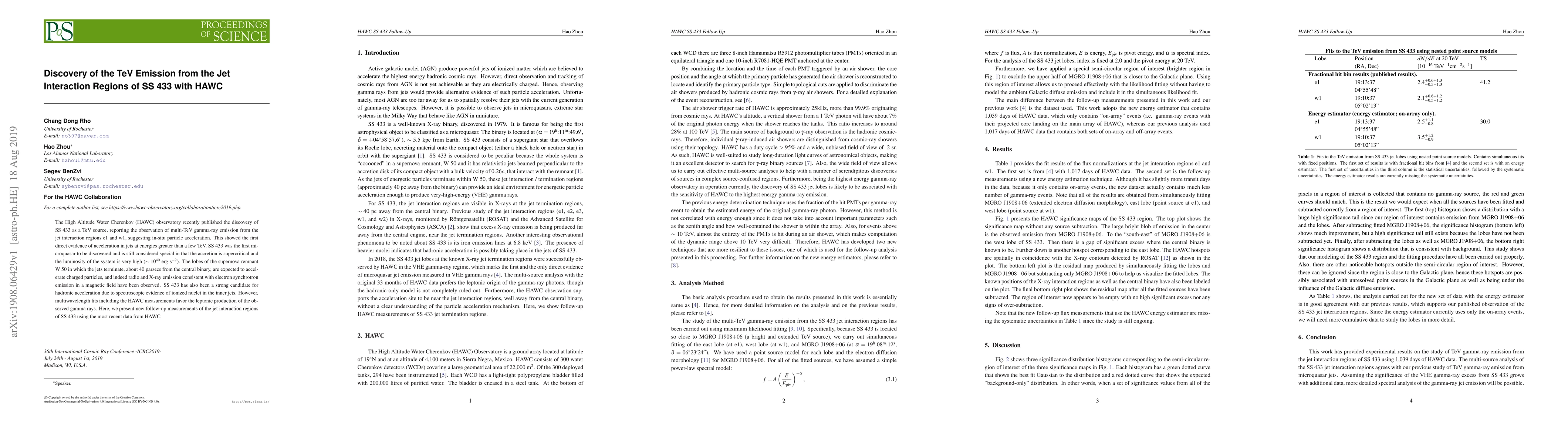 The HAWC observatory discovered TeV gamma-ray emission from the jet interaction regions e1 and w1 of SS 433, providing the first direct evidence of particle acceleration at energies greater than a few TeV. Multiwavelength fits favor leptonic production of the observed gamma rays over hadronic mechanisms.