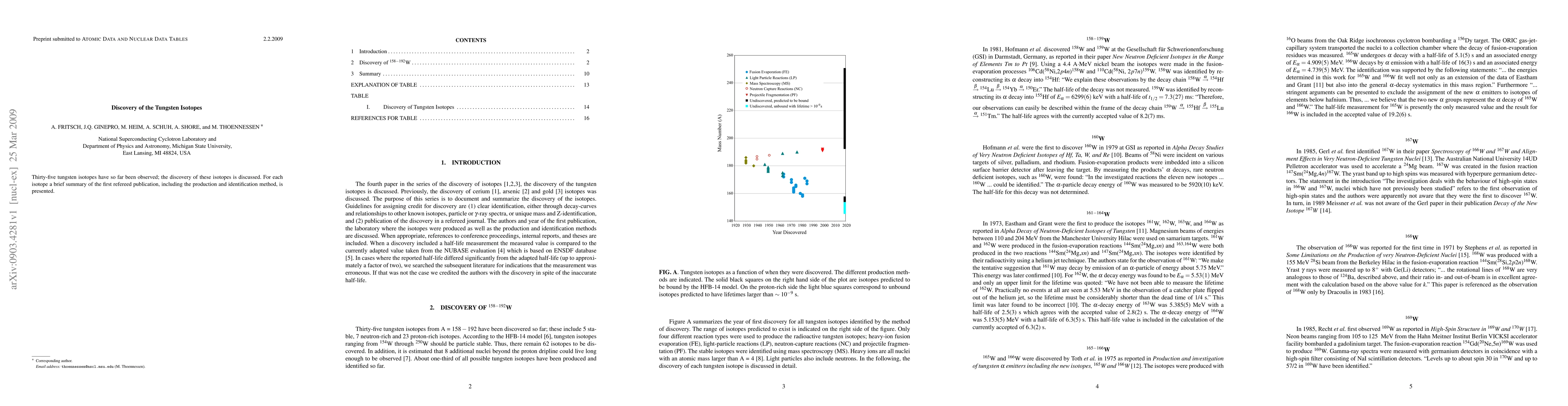 Thirty-five tungsten isotopes have so far been observed; the discovery of these isotopes is discussed. For each isotope a brief summary of the first refereed publication, including the production and identification method, is presented.