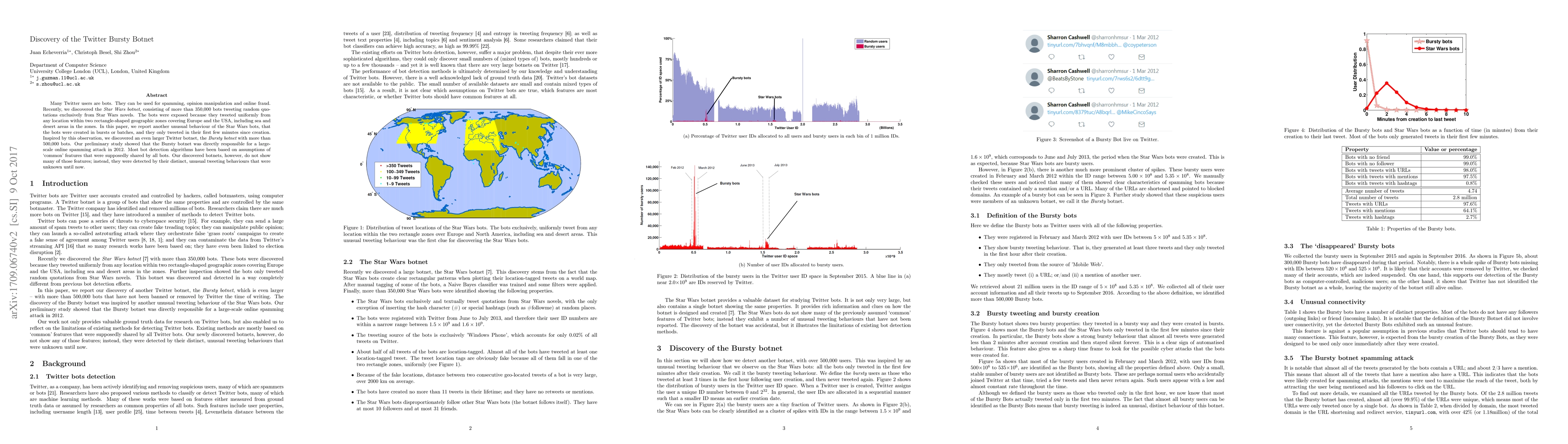 Many Twitter users are bots. They can be used for spamming, opinion manipulation and online fraud. Recently we discovered the Star Wars botnet, consisting of more than 350,000 bots tweeting random quotations exclusively from Star Wars novels. The bots were exposed because they tweeted uniformly from any location within two rectangle-shaped geographic zones covering Europe and the USA, including sea and desert areas in the zones. In this paper, we report another unusual behaviour of the Star Wars bots, that the bots were created in bursts or batches, and they only tweeted in their first few minutes since creation. Inspired by this observation, we discovered an even larger Twitter botnet, the Bursty botnet with more than 500,000 bots. Our preliminary study showed that the Bursty botnet was directly responsible for a large-scale online spamming attack in 2012. Most bot detection algorithms have been based on assumptions of `common' features that were supposedly shared by all bots. Our discovered botnets, however, do not show many of those features; instead, they were detected by their distinct, unusual tweeting behaviours that were unknown until now.