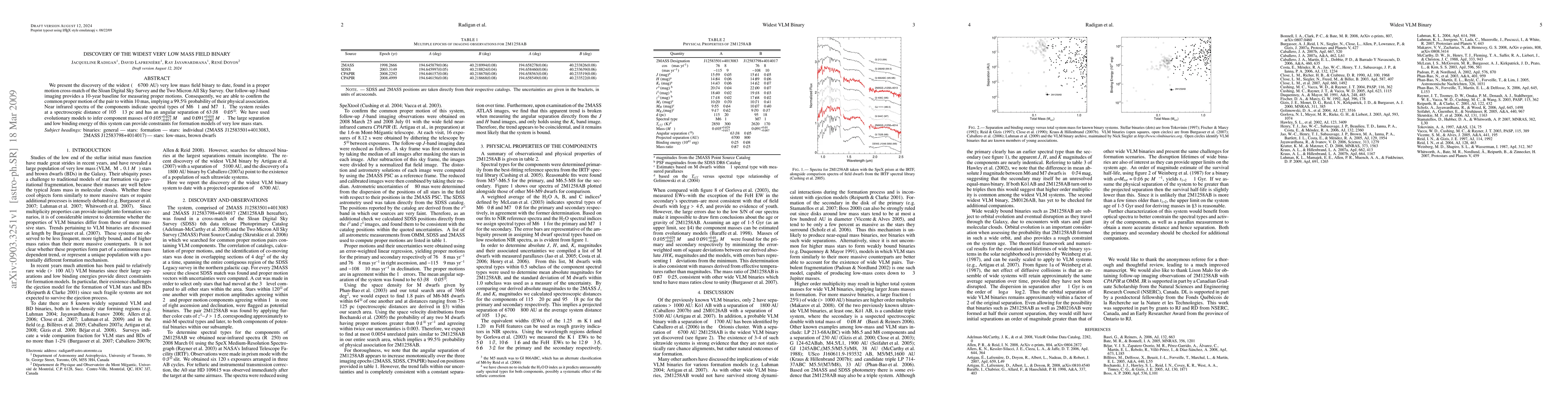 This paper reports the discovery of the widest known very low mass field binary, separated by ~6700 AU, identified through cross-matching surveys. Follow-up imaging confirms a 10-year proper motion baseline, supporting the physical association of the M6 and M7 spectral type components at a distance of 105±13 pc.