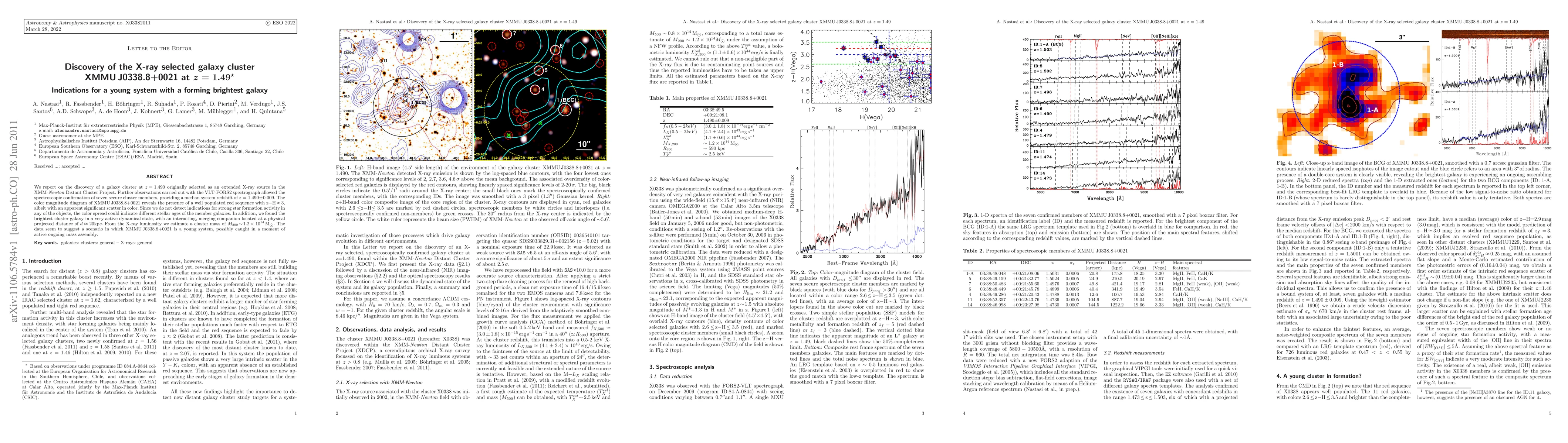 We report on the discovery of a galaxy cluster at z = 1.490 originally selected as an extended X-ray source in the XMM-Newton Distant Cluster Project. Further observations carried out with the VLT-FORS2 spectrograph allowed the spectroscopic confirmation of seven secure cluster members, providing a median system redshift of z = 1.490 +/- 0.009. The color magnitude diagram of XMMU J0338.8+0021 reveals the presence of a well populated red sequence with z-H ~ 3, albeit with an apparent significant scatter in color. Since we do not detect indications for strong star formation activity in any of the objects, the color spread could indicate different stellar ages of the member galaxies. In addition, we found the brightest cluster galaxy in a very active dynamical state, with an interacting, merging companion located at a physical projected distance of d ~ 20kpc. From the X-ray luminosity we estimate a cluster mass of M200 ~ 1.2 x 10^(14) Msun. The data seem to suggest a scenario in which XMMU J0338.8+0021 is a young system, possibly caught in a moment of active ongoing mass assembly.