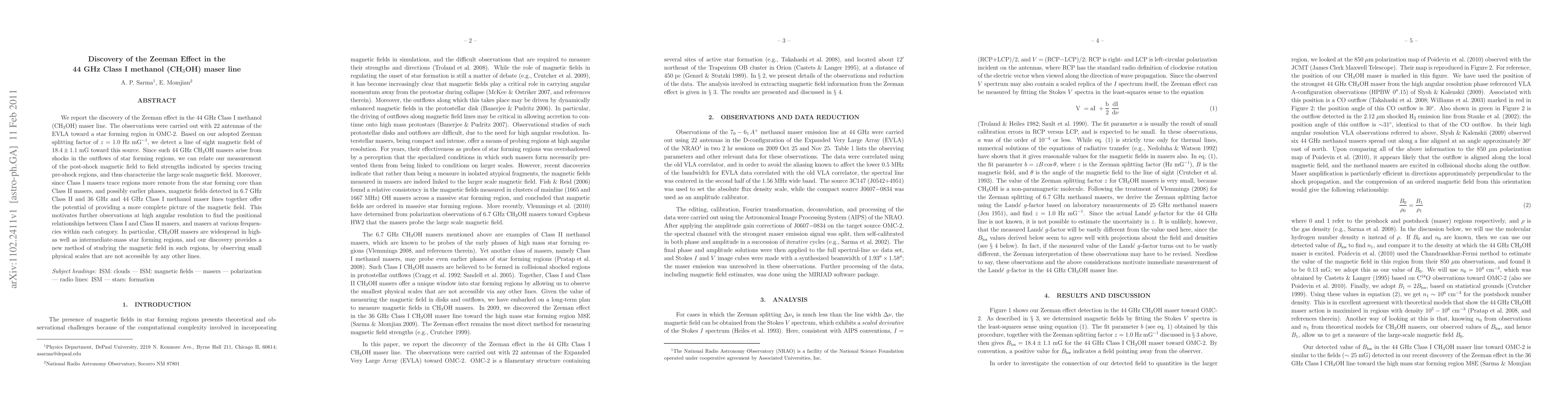 This paper reports the discovery of the Zeeman effect in the 44 GHz Class I methanol maser line, revealing a magnetic field of 18.4 +/- 1.1 mG in a star-forming region. This discovery provides a new method for studying magnetic fields in star-forming regions at small scales.