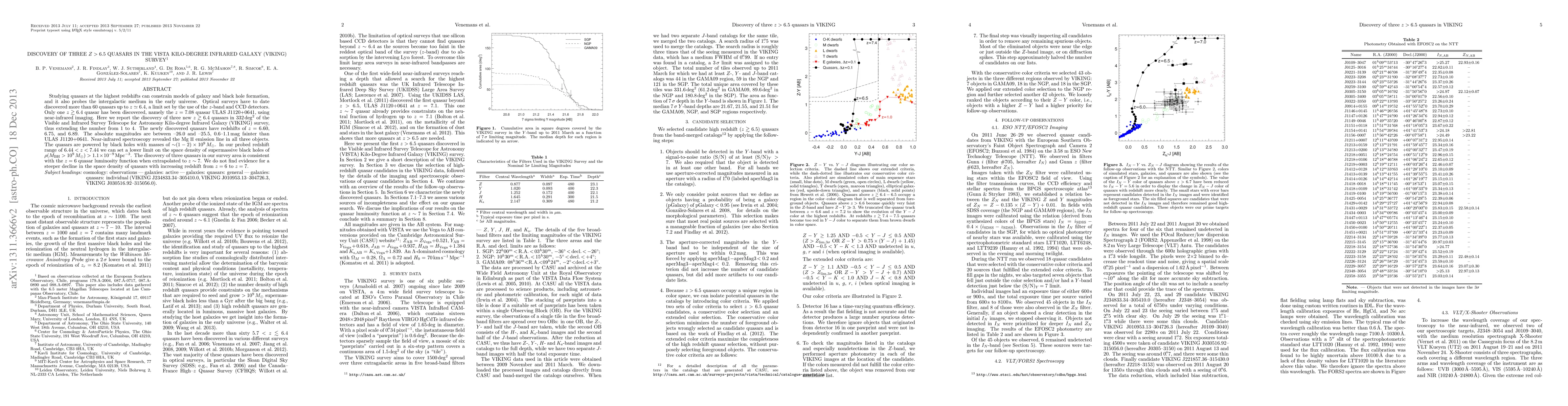 This paper reports the discovery of three quasars with redshifts greater than 6.5 in the VIKING survey, expanding the known population of high-redshift quasars to four. These findings provide insights into early black hole formation and the intergalactic medium, and suggest no significant decline in quasar density from z=6 to z=7.
