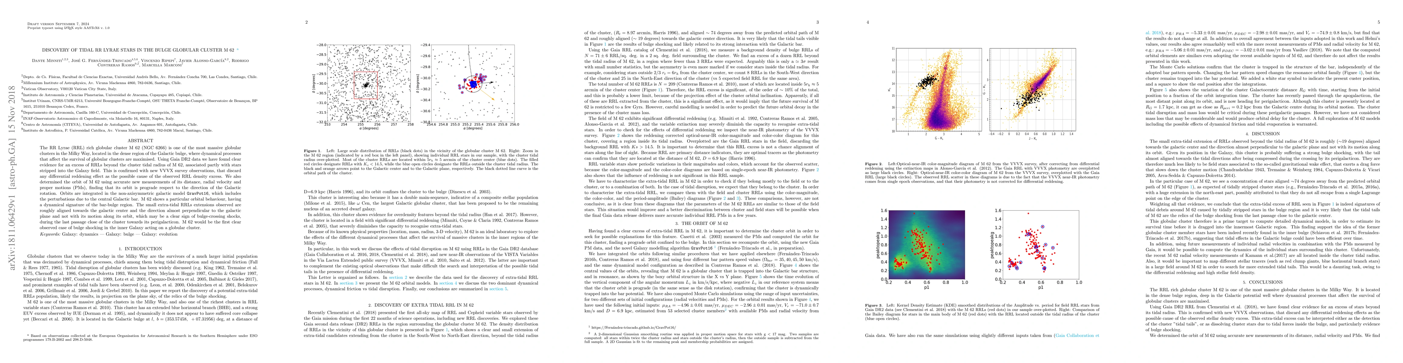 The RR Lyrae (RRL) rich globular cluster M 62 (NGC 6266) is one of the most massive globular clusters in the Milky Way, located in the dense region of the Galactic bulge, where dynamical processes that affect the survival of globular clusters are maximised. Using Gaia DR2 data we have found clear evidence for an excess of RRLs beyond the cluster tidal radius of M 62, associated partly with stars stripped into the Galaxy field. This is confirmed with new VVVX survey observations, that discard any differential reddening effect as the possible cause of the observed RRL density excess. We also determined the orbit of M 62 using accurate new measurements of its distance, radial velocity and proper motions (PMs), finding that its orbit is prograde respect to the direction of the Galactic rotation. Orbits are integrated in the non-axisymmetric galactic model \texttt{GravPot16}, which includes the perturbations due to the central Galactic bar. M 62 shows a particular orbital behaviour, having a dynamical signature of the bar-bulge region. The small extra-tidal RRLs extensions observed are roughly aligned towards the galactic center and the direction almost perpendicular to the galactic plane and not with its motion along its orbit, which may be a clear sign of bulge-crossing shocks, during the last passage close of the cluster towards its perigalacticon. M 62 would be the first clear observed case of bulge shocking in the inner Galaxy acting on a globular cluster.