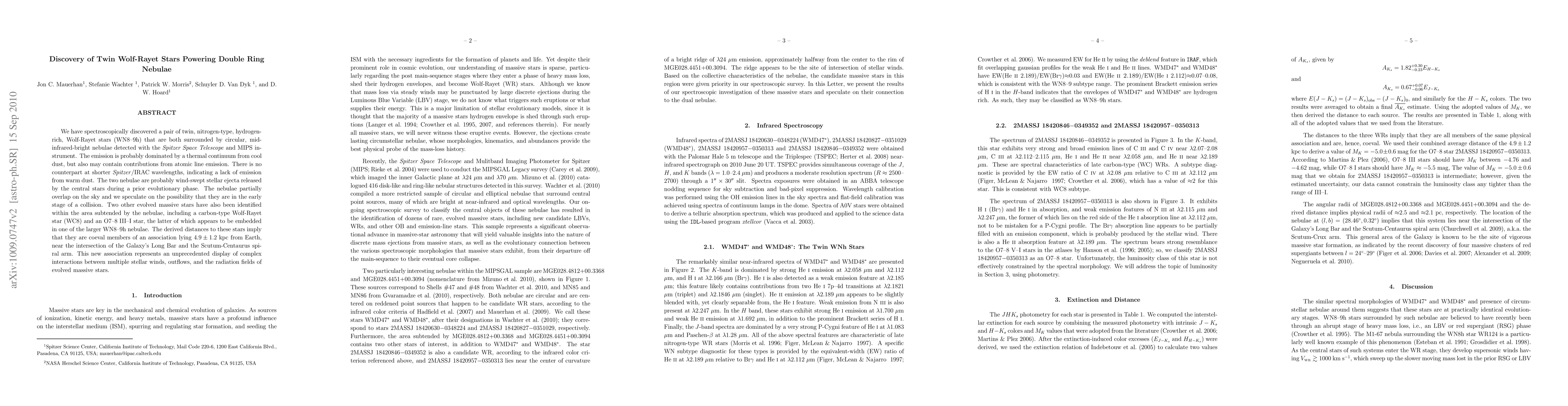 This research identifies twin nitrogen-type Wolf-Rayet stars surrounded by overlapping, mid-infrared-bright nebulae, likely formed from wind-swept stellar ejecta. The nebulae's interaction suggests an early stage of collision, with additional evolved stars nearby, forming a new coeval stellar association.